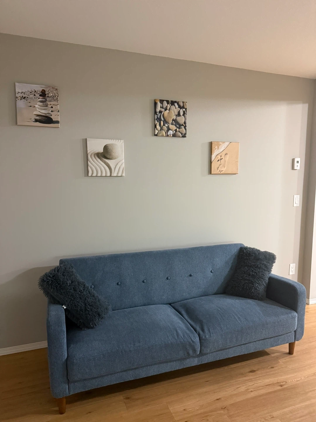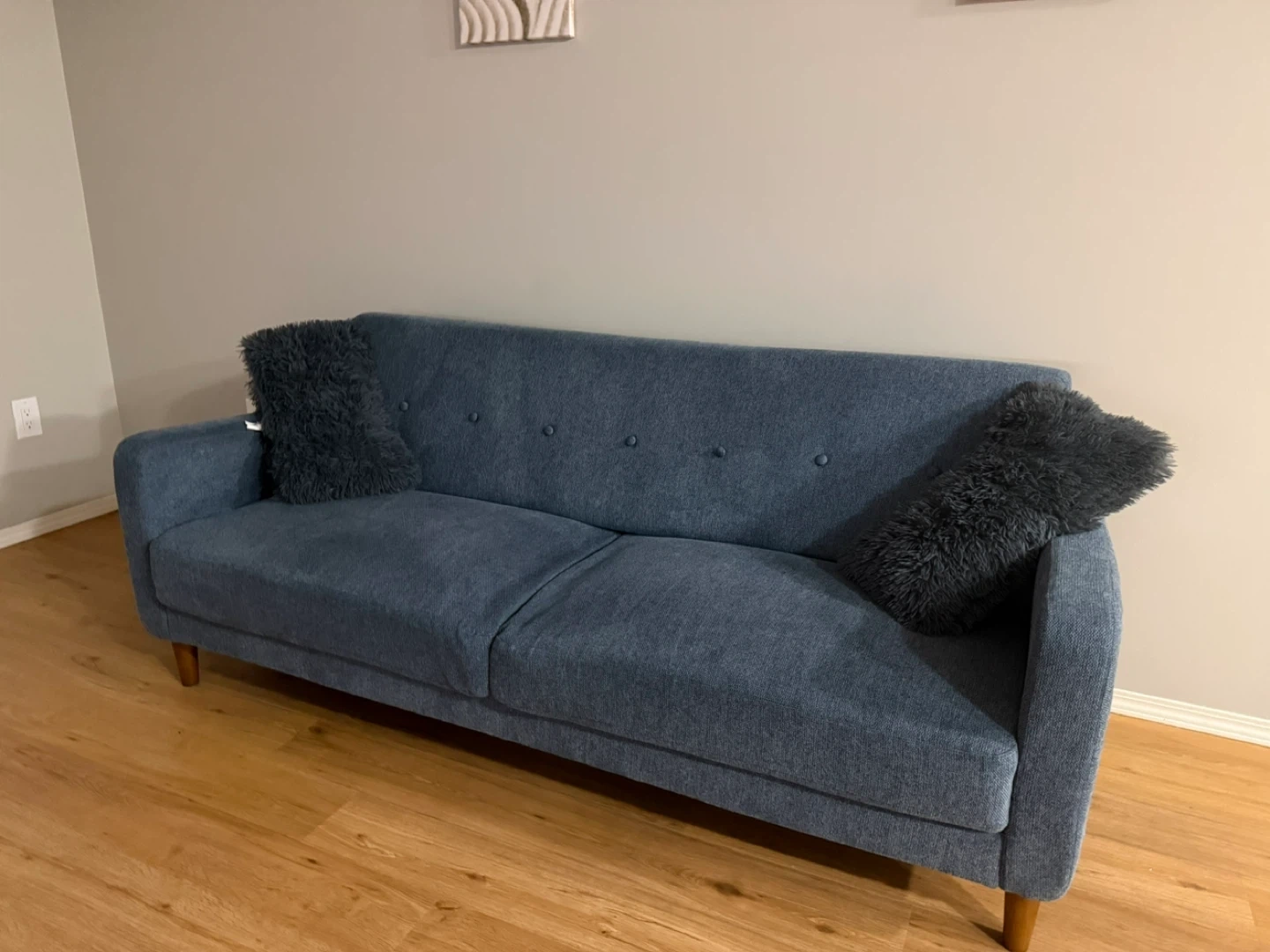 Selling a comfy blue fabric sofa! It's in great condition and would look great in any living room. The colour is a nice muted blue, and the fabric has a nice texture. It's a great size for apartments or smaller living spaces