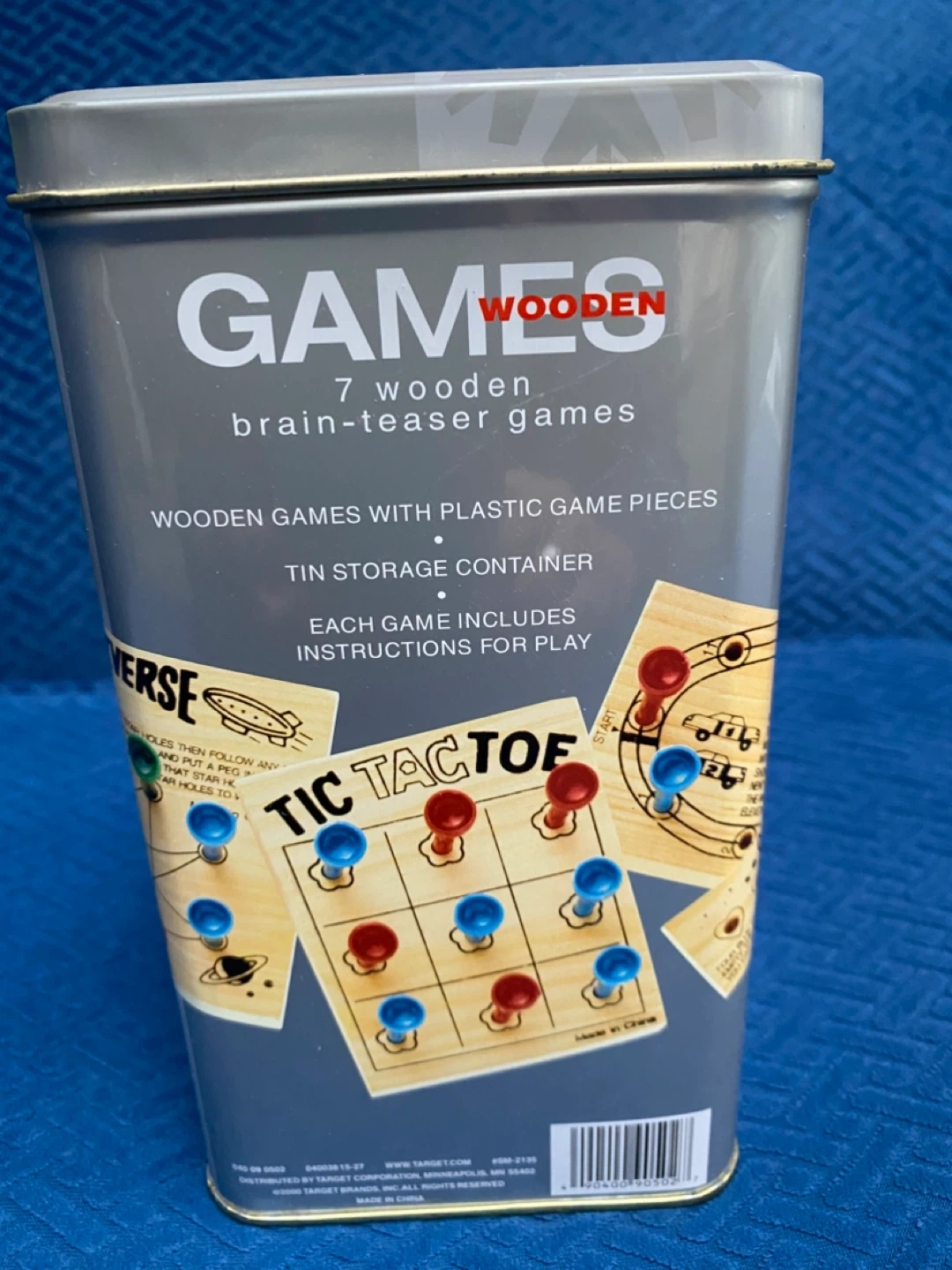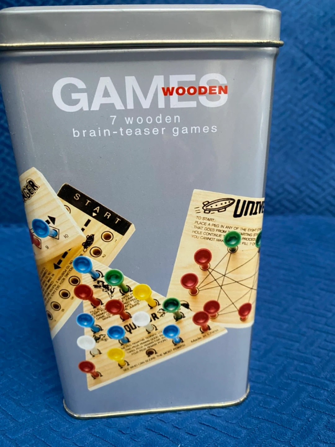 Selling a set of 7 wooden brain-teaser games! They come in a tin storage container and include instructions for each game. Perfect for some challenging fun!