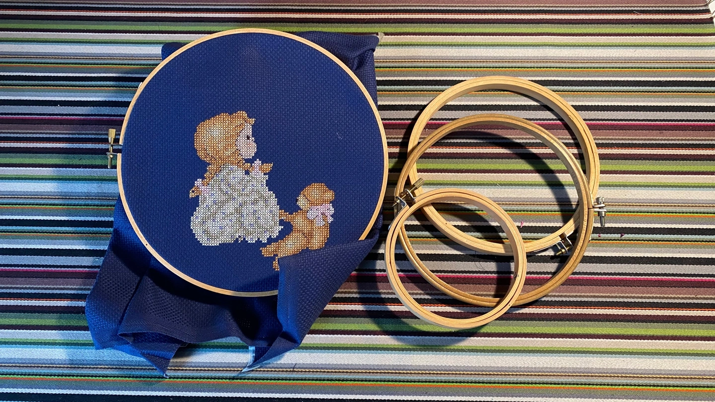 A collection of cross-stitch books and kits, perfect for crafting enthusiasts! Includes titles like "The Tale of Peter Rabbit", "I Love Miniatures", and "Precious Moments", along with "The Cricket Collection" patterns. Also comes with cross-stitch hoops and fabric to get you started on your next project