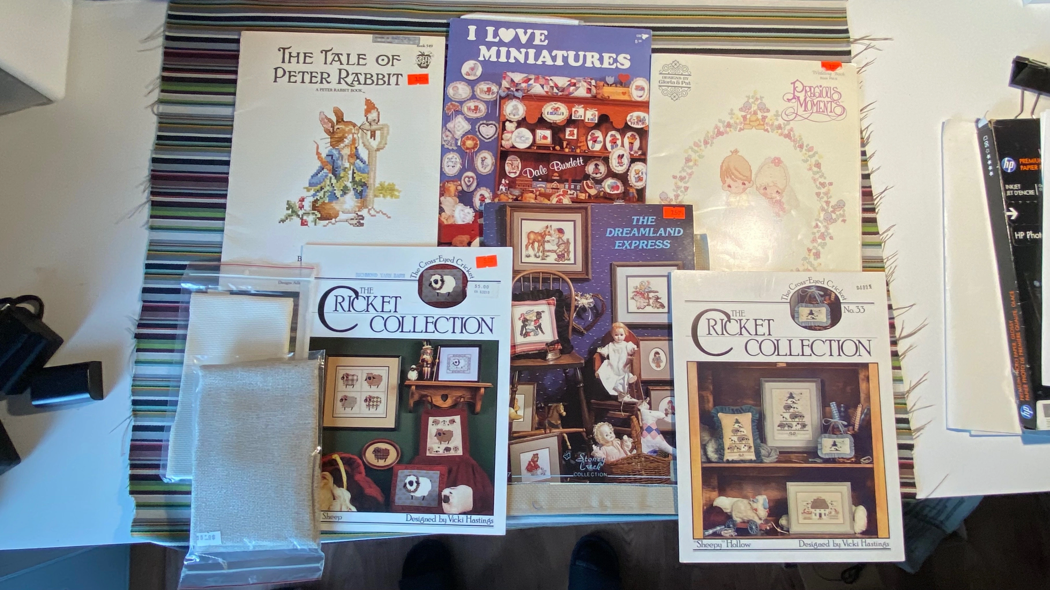 A collection of cross-stitch books and kits, perfect for crafting enthusiasts! Includes titles like "The Tale of Peter Rabbit", "I Love Miniatures", and "Precious Moments", along with "The Cricket Collection" patterns. Also comes with cross-stitch hoops and fabric to get you started on your next project