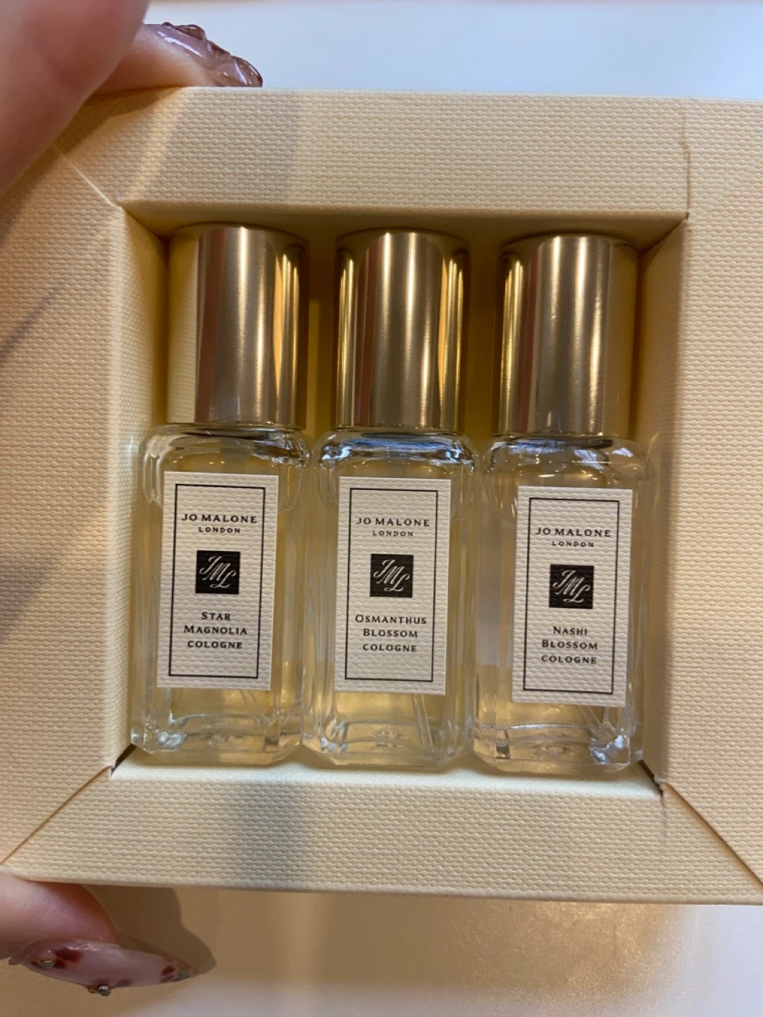 Selling a set of three Jo Malone colognes, including Star Magnolia, Osmanthus Blossom, and Nashi Blossom. They come in the original box!