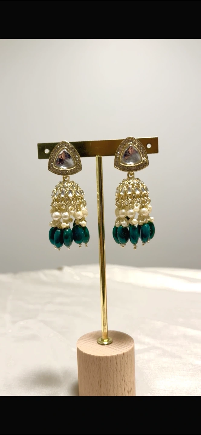 Selling a pair of beautiful jhumka earrings. They feature a gold-tone finish, white pearls, and green beads. These earrings are perfect for adding a touch of elegance to any outfit!