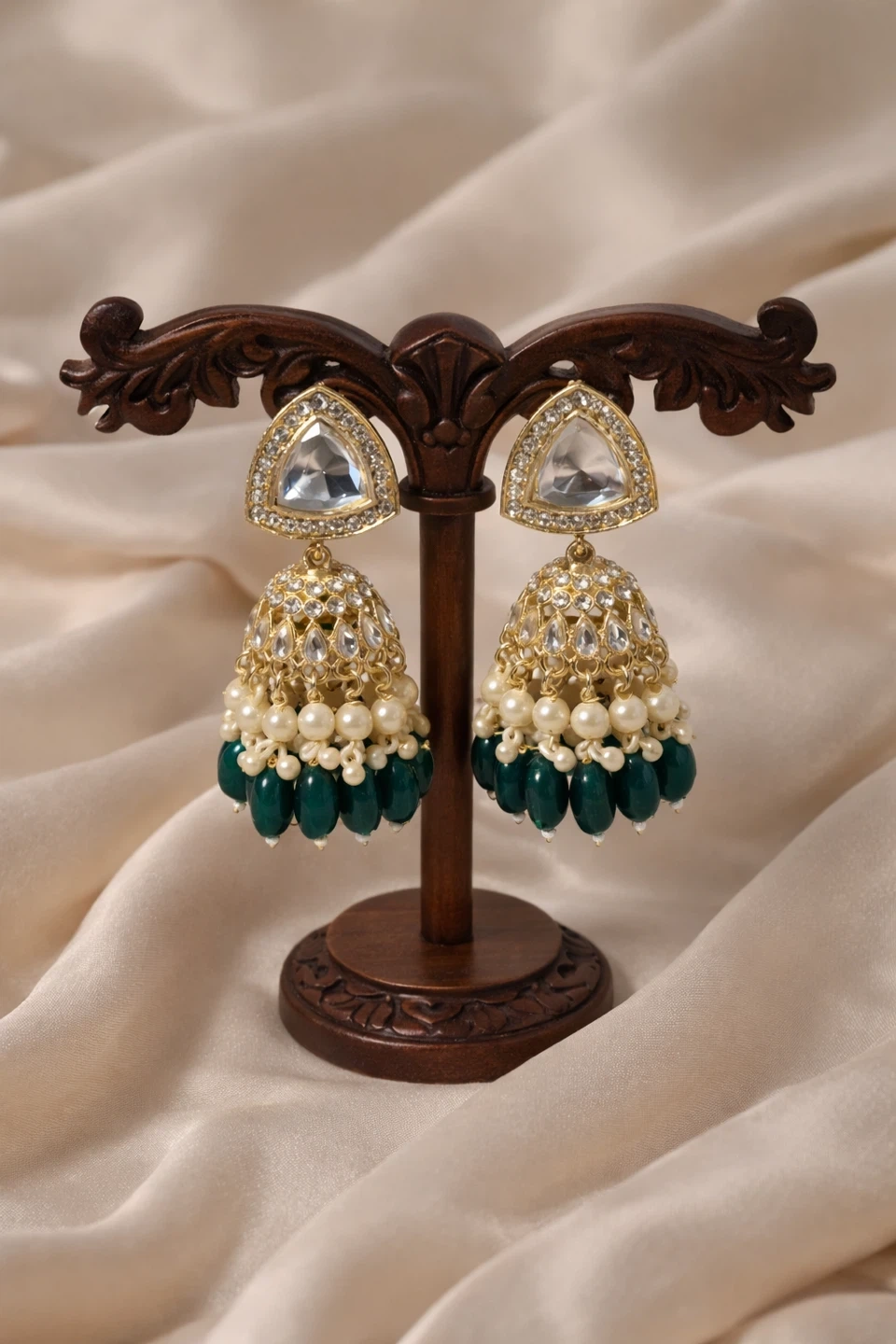 Indian Jhumka Earrings - Gold, White, and Green