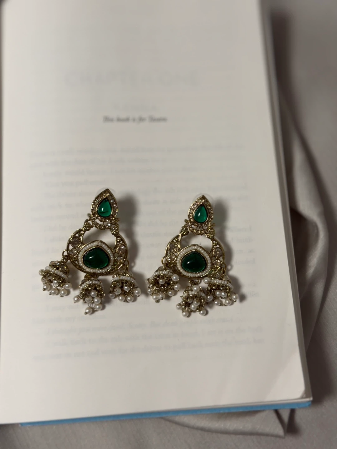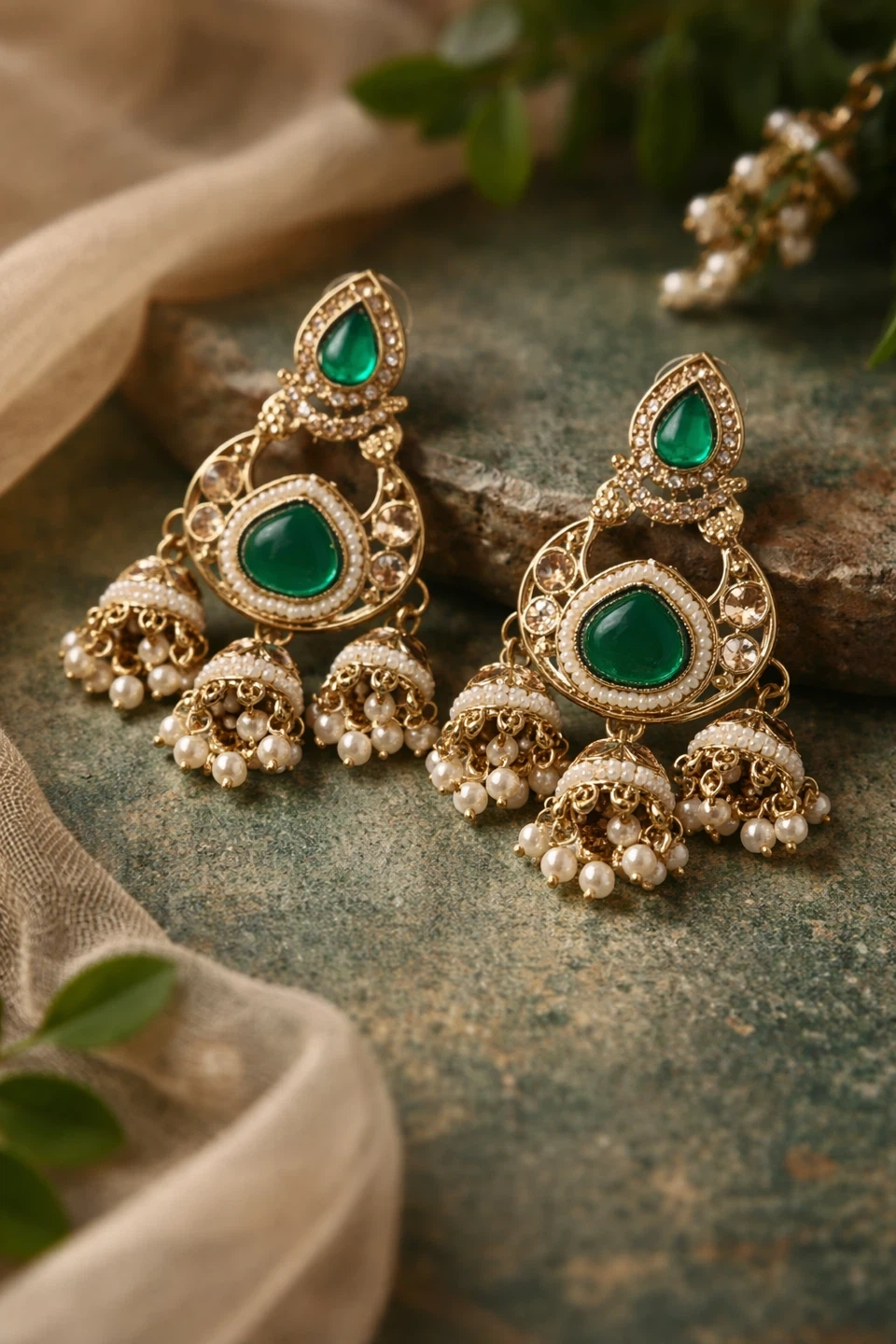 Beautiful pair of green and gold jhumka earrings. They have a lovely traditional design with faux pearls and green stones. Perfect for adding a touch of elegance to any outfit!