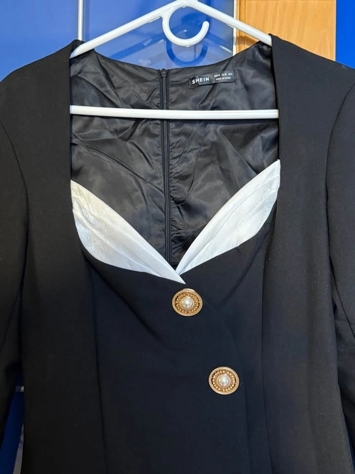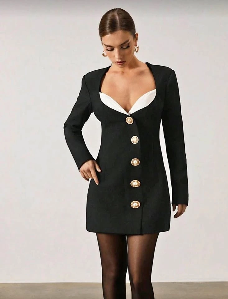 Black blazer-style mini dress with gold button detailing and contrast bust detail. Structured, flattering fit — looks much more expensive than it is.
