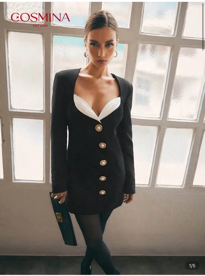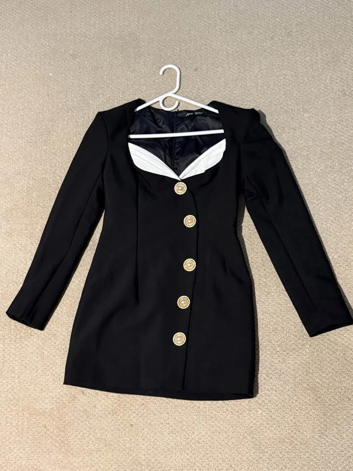 Black blazer-style mini dress with gold button detailing and contrast bust detail. Structured, flattering fit — looks much more expensive than it is.