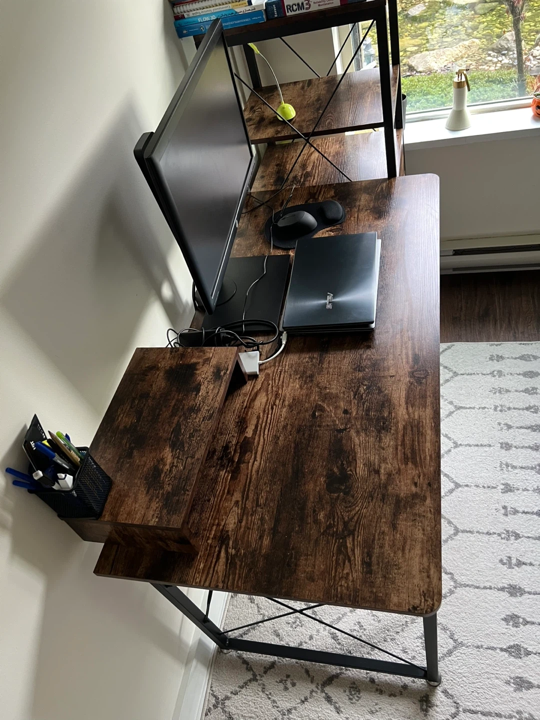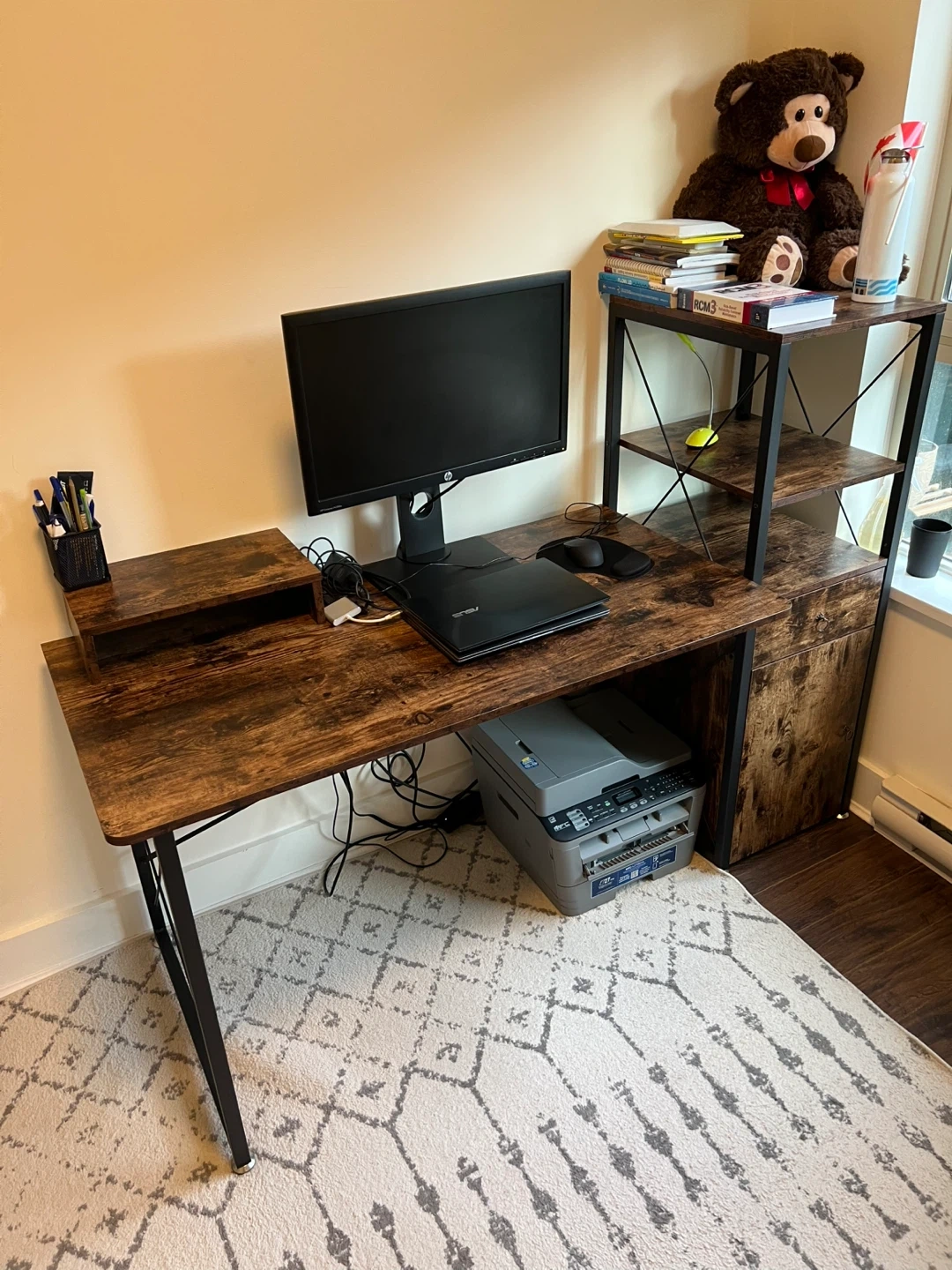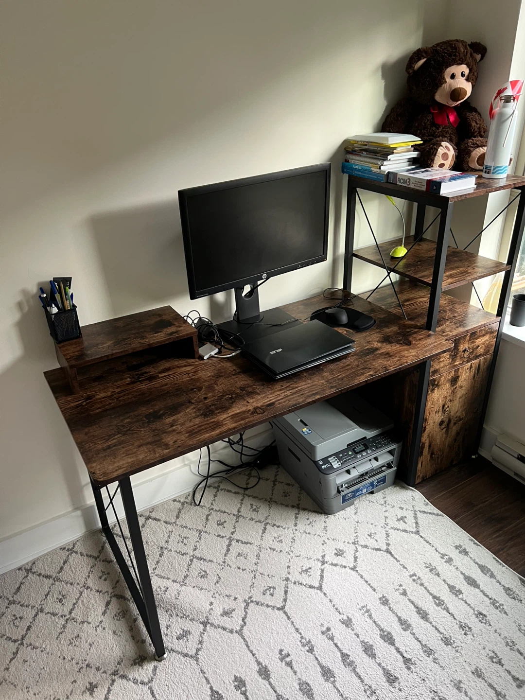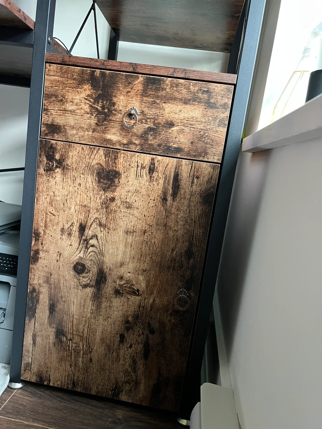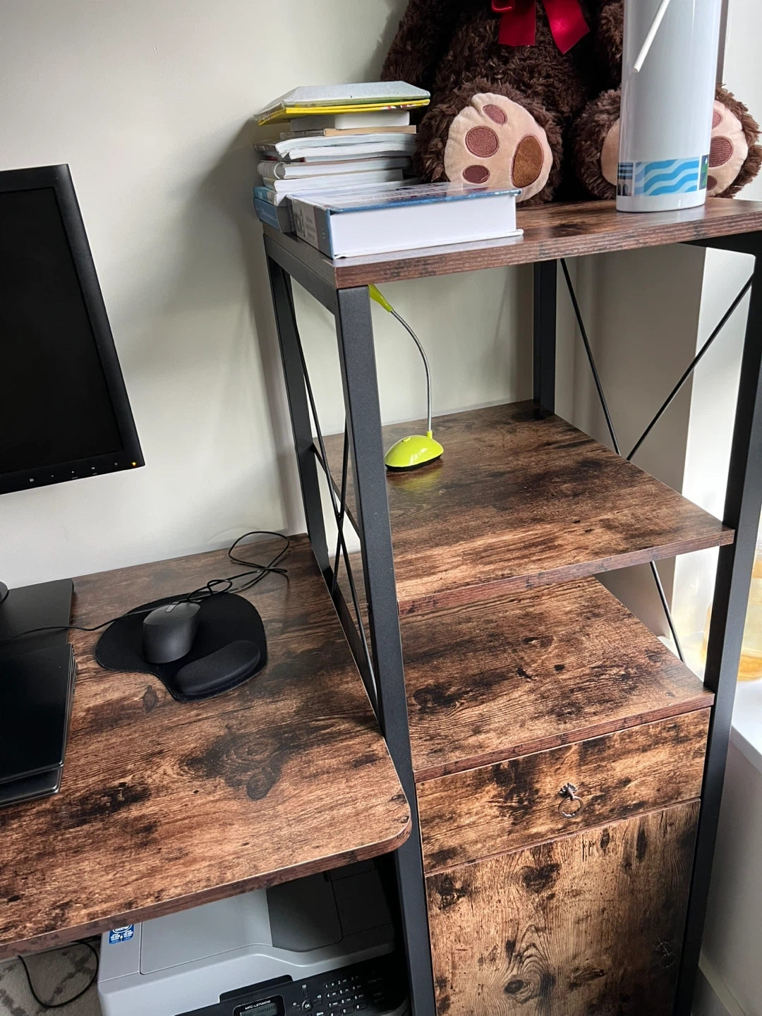 Selling a computer desk with a rustic brown finish and built-in storage! It features a drawer and a cabinet for keeping your workspace tidy. The desk has a sturdy black metal frame. Great for a home office or study space!