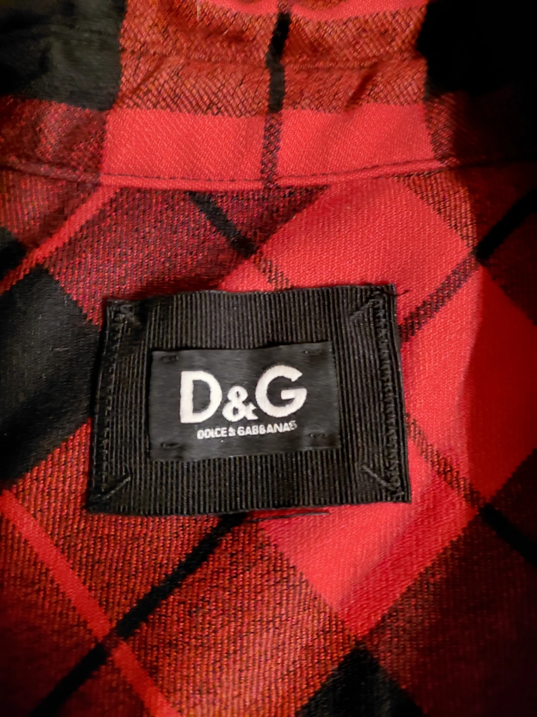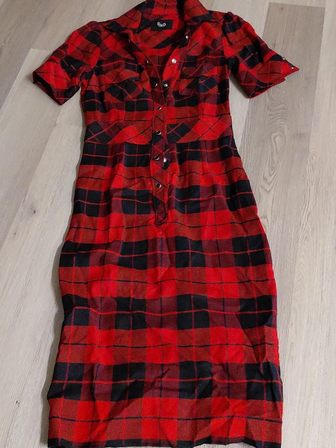 This is a D&G Dolce & Gabbana dress in a red and black plaid pattern. It has short sleeves and a button-down front. It's in great condition and ready for a new wardrobe