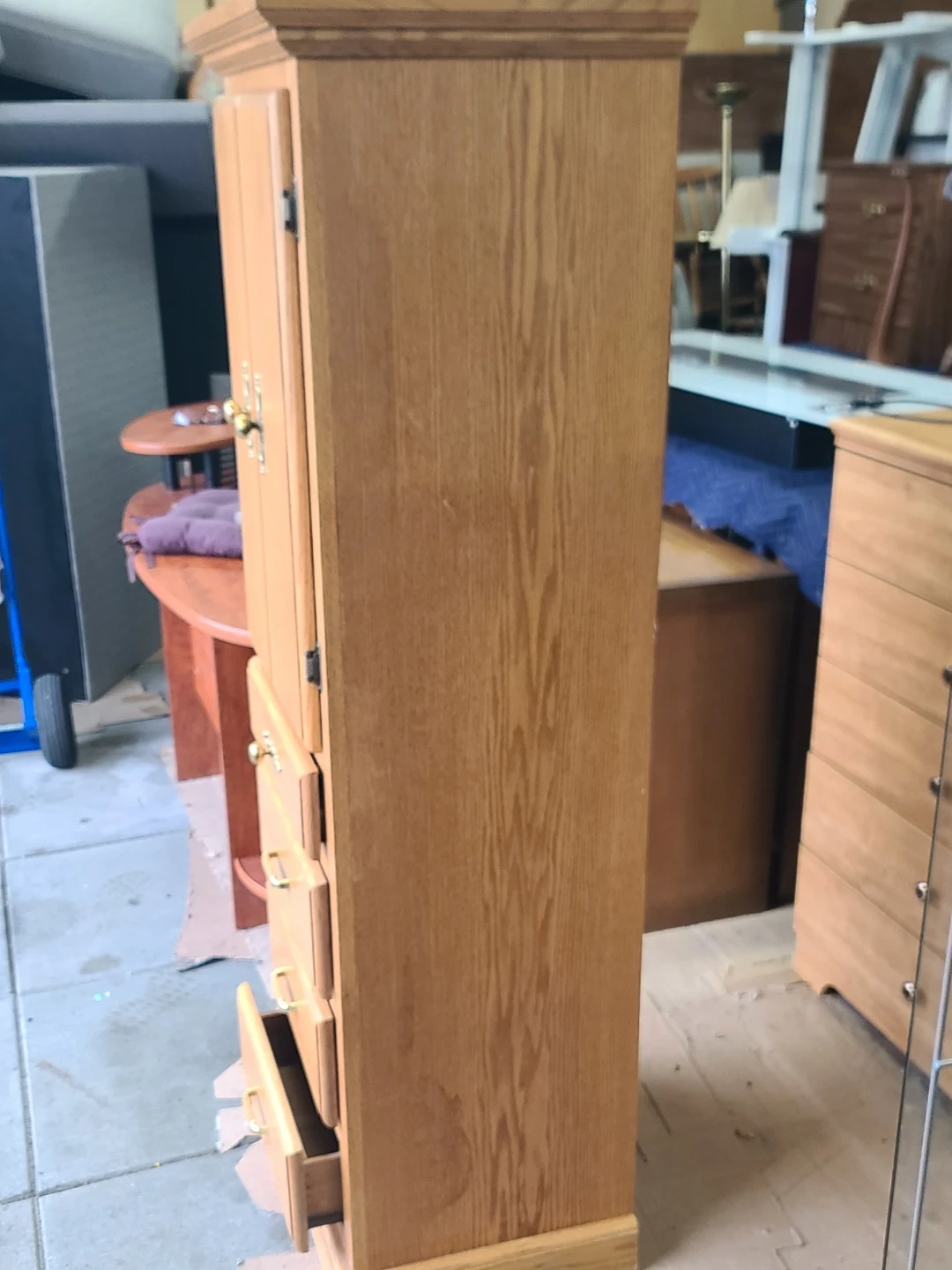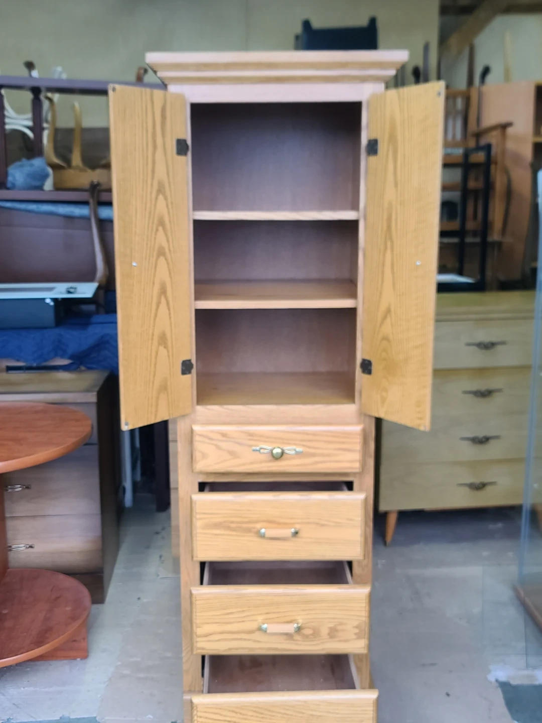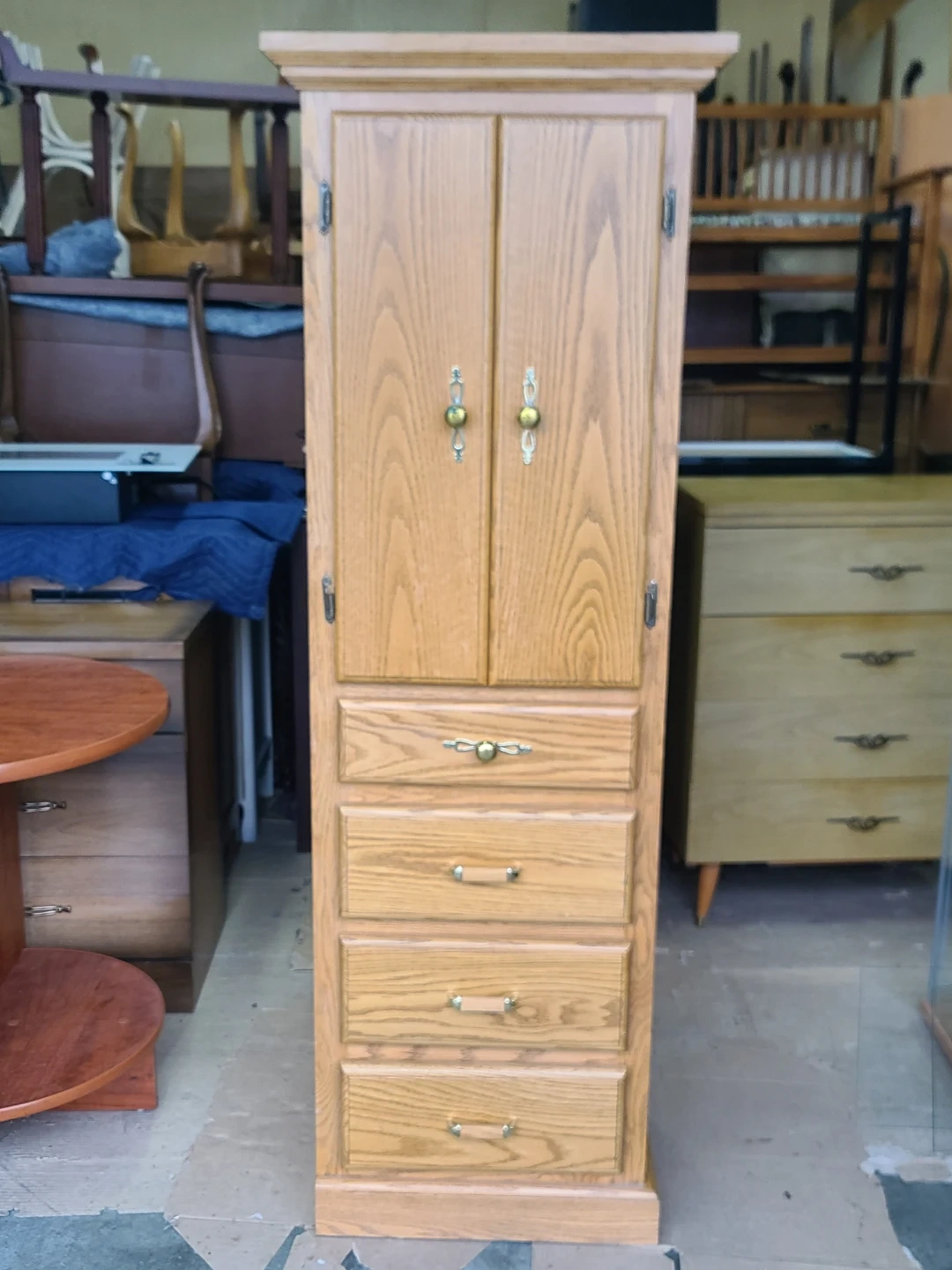 A solid oak armoire, perfect for adding storage to a bedroom or living space! It features a cabinet on top with shelving inside, and 4- drawers below for extra organization. It's in good condition. Measurements: W 23 1/2" × D 18 1/2" × H 68". Delivery can be arranged. Viewing and pickup by appointment.