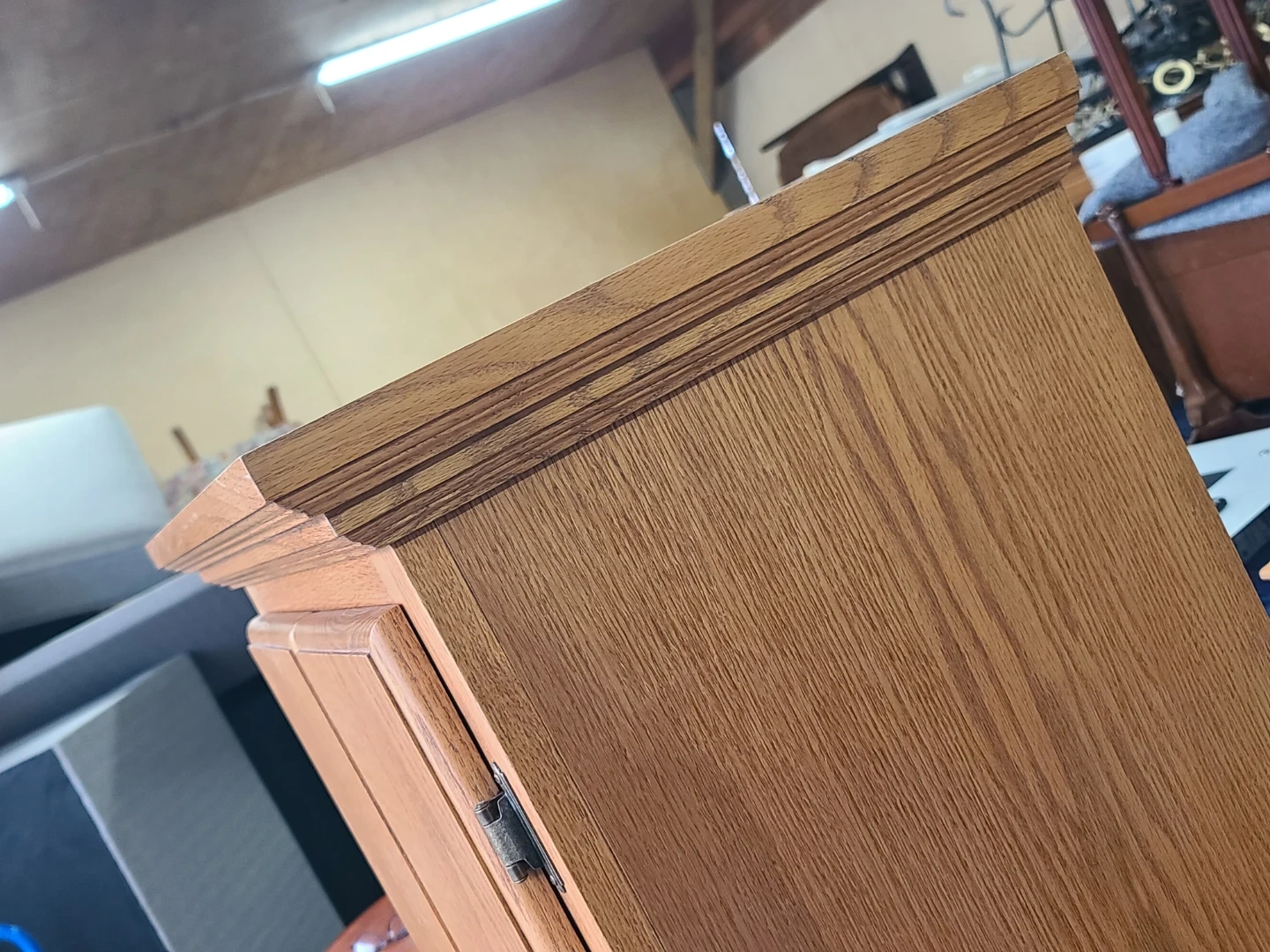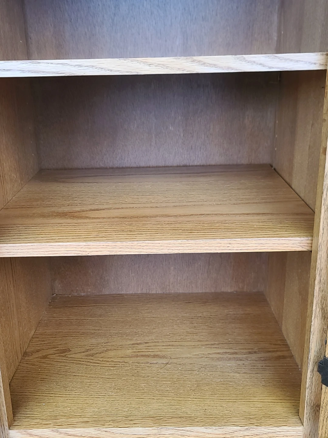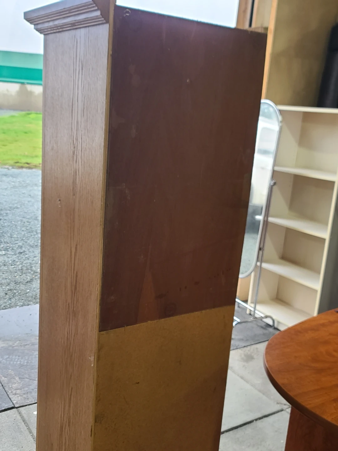 A solid oak armoire, perfect for adding storage to a bedroom or living space! It features a cabinet on top with shelving inside, and 4- drawers below for extra organization. It's in good condition. Measurements: W 23 1/2" × D 18 1/2" × H 68". Delivery can be arranged. Viewing and pickup by appointment.