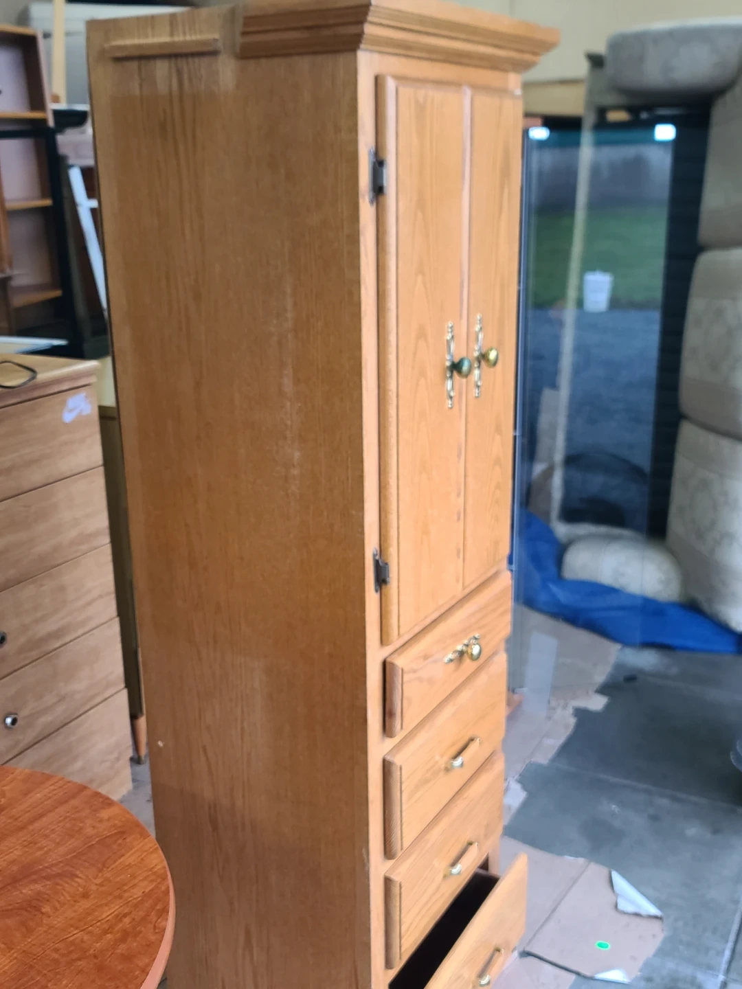 A solid oak armoire, perfect for adding storage to a bedroom or living space! It features a cabinet on top with shelving inside, and 4- drawers below for extra organization. It's in good condition. Measurements: W 23 1/2" × D 18 1/2" × H 68". Delivery can be arranged. Viewing and pickup by appointment.