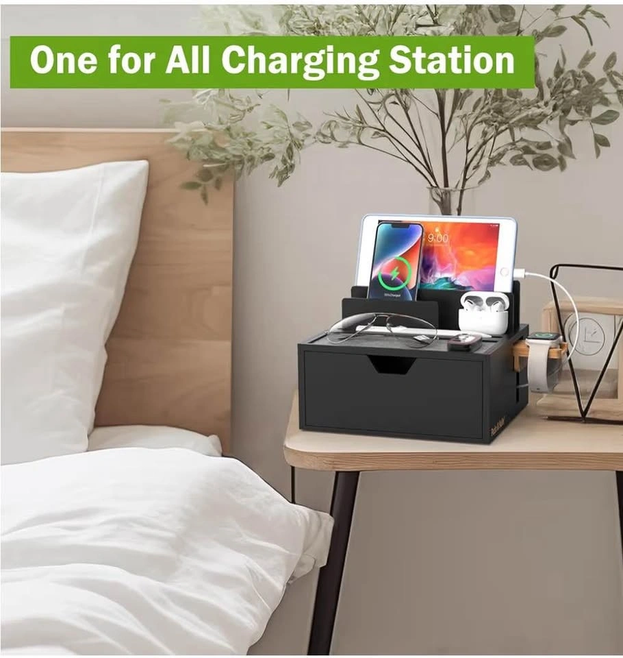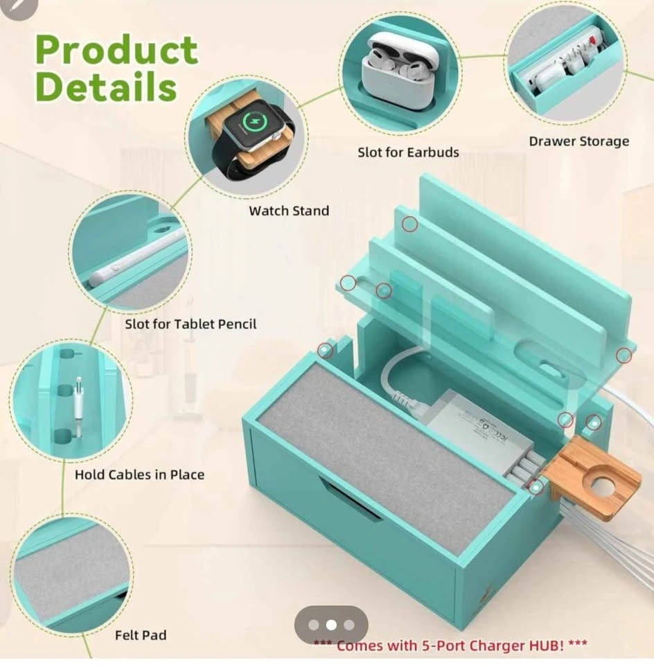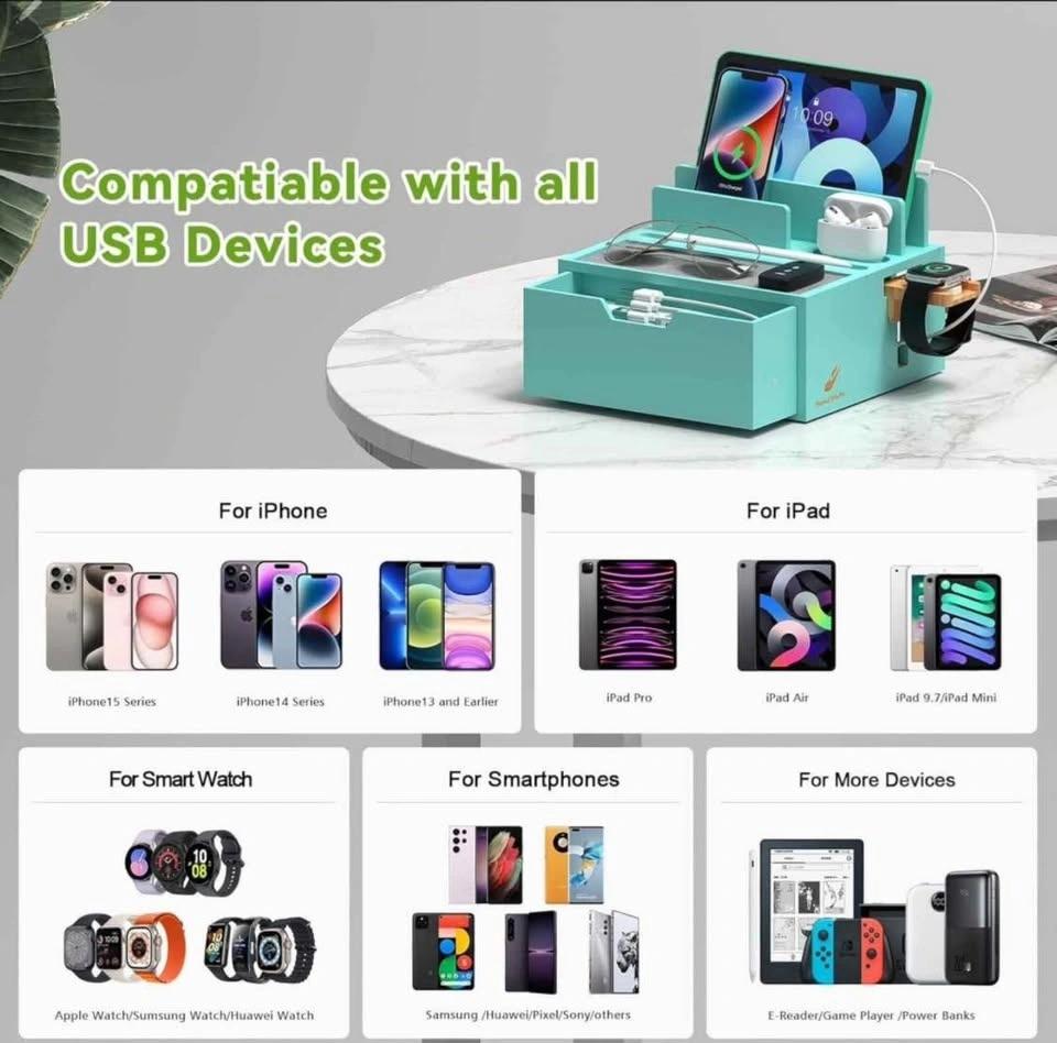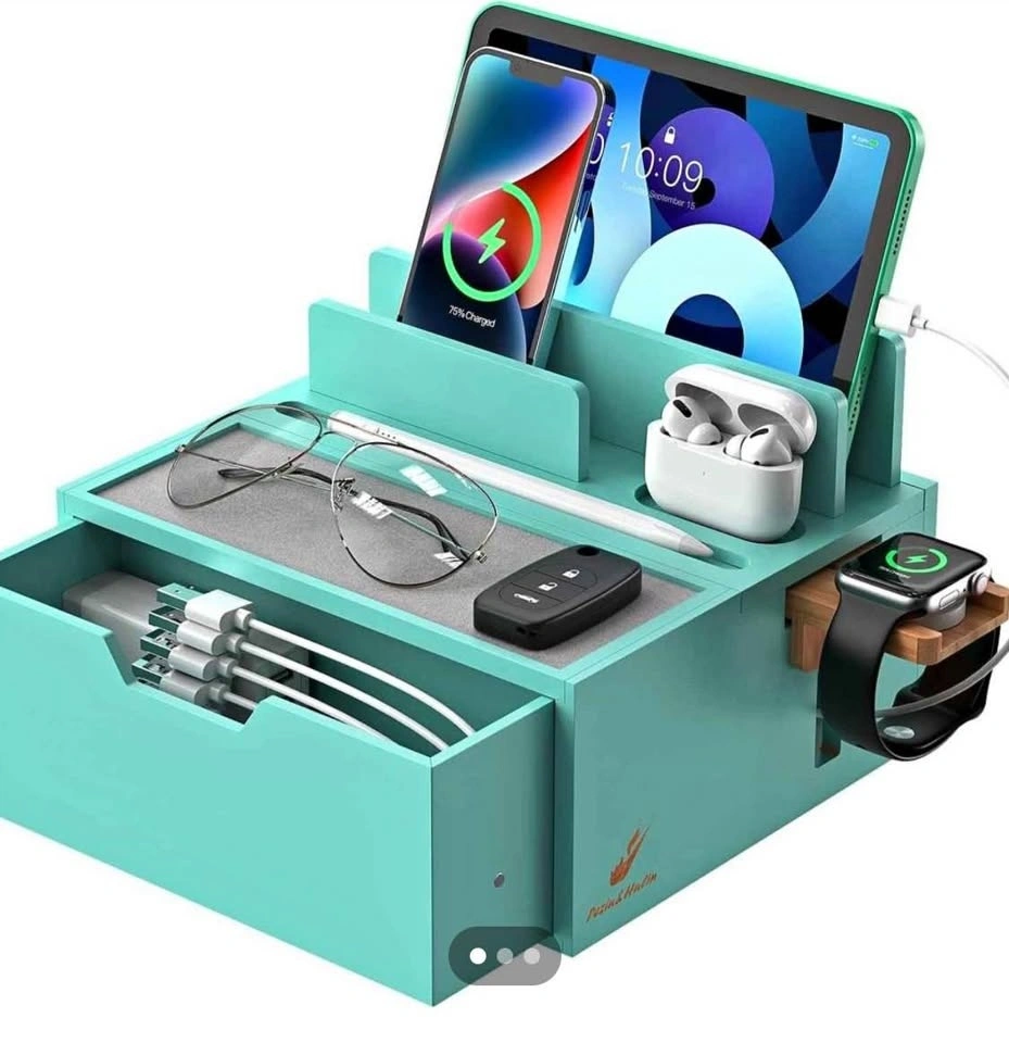 Durable Bamboo charging station for multiple devices, 5 port USB charger, phone docking station with lined tray and drawer, comes with 5 charging cables. LIGHT TEAL COLOUR MODEL.