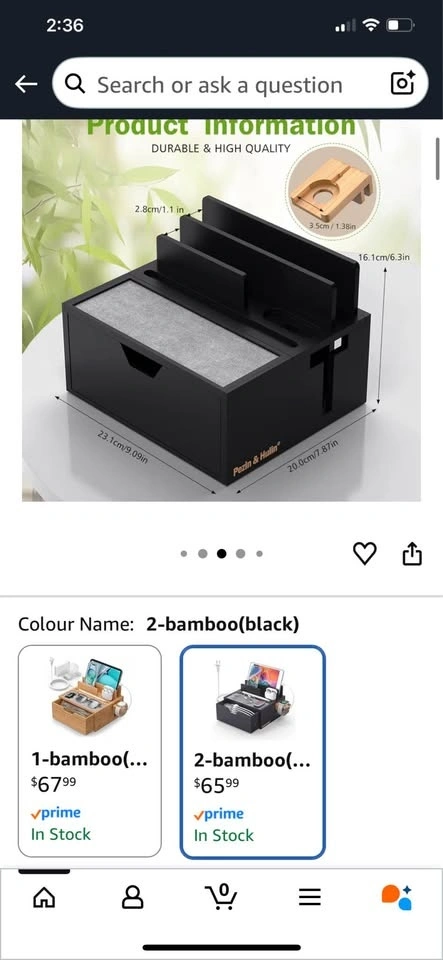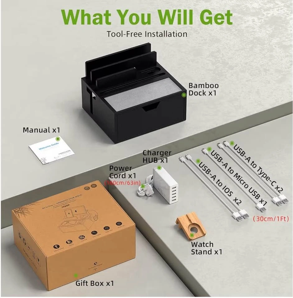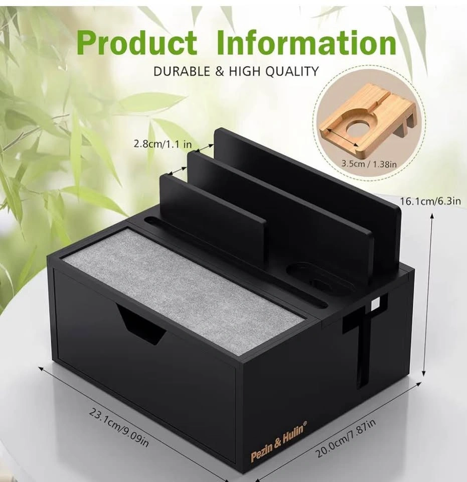 Durable Bamboo charging station for multiple devices, 5 port USB charger, phone docking station with lined tray and drawer, comes with 5 charging cables. LIGHT TEAL COLOUR MODEL.