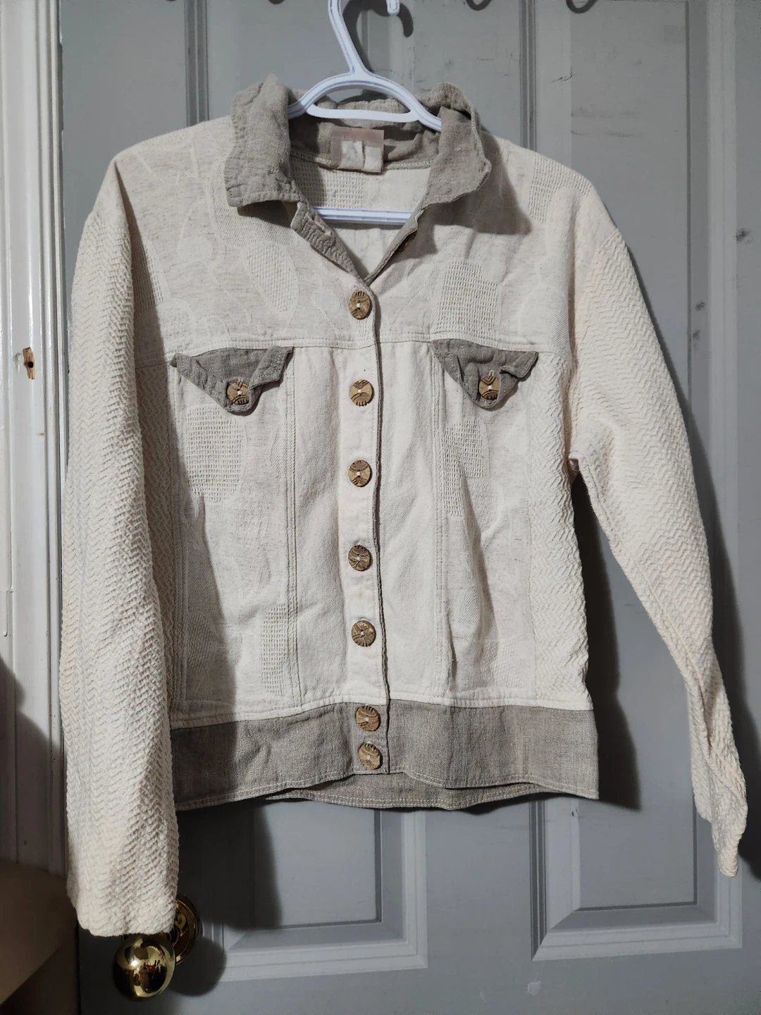 Here's a cute vintage-style jacket that I'm hoping to pass on to someone new! It's cream-coloured with grey accents, and has unique wooden-style buttons. It's in great condition and ready for a new owner!