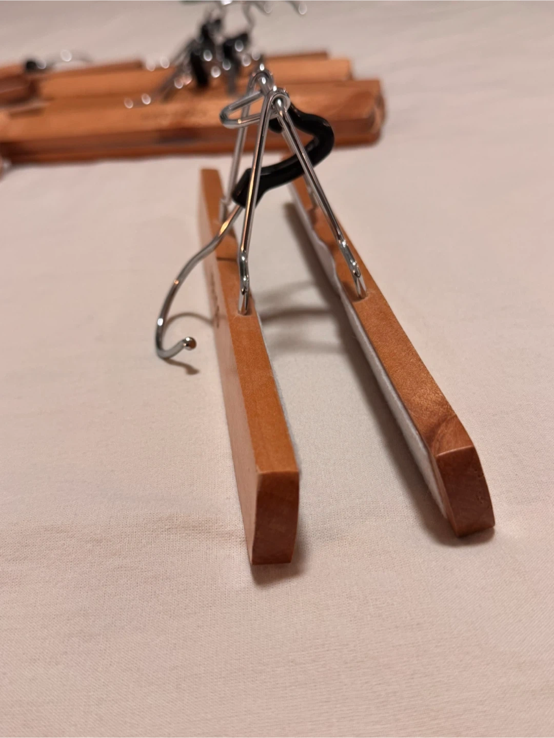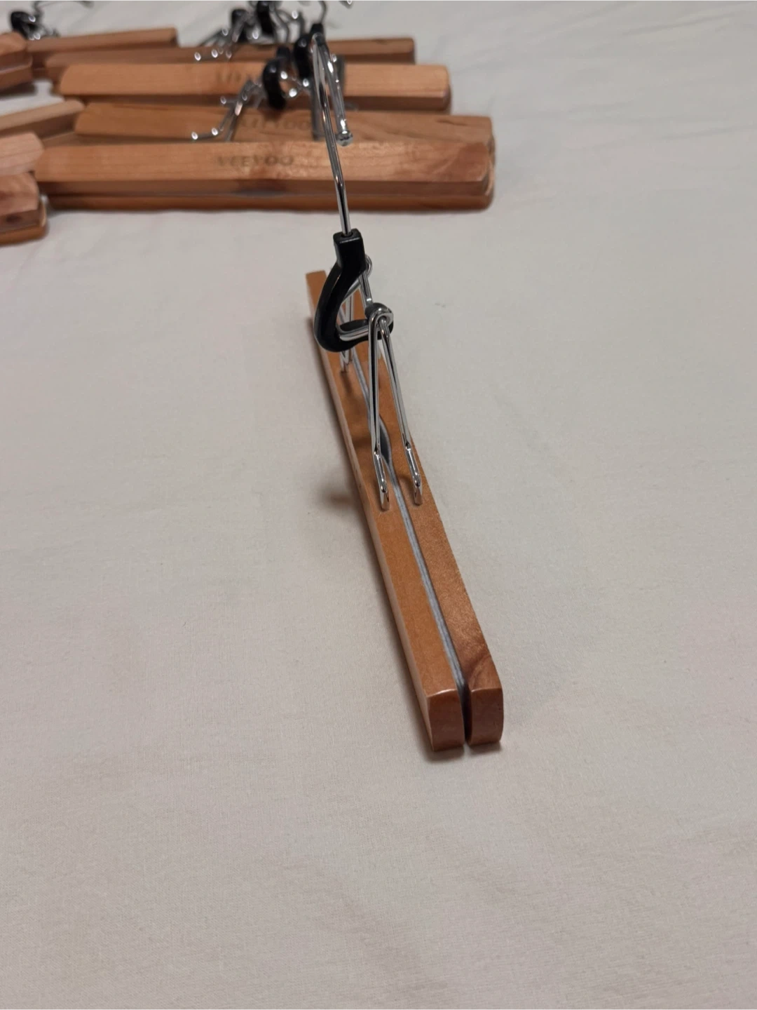 Selling a set of 10 Veeyoo wooden pant hangers! These hangers are great for keeping your pants wrinkle-free and organized. They're made of wood and have a sturdy metal clip.