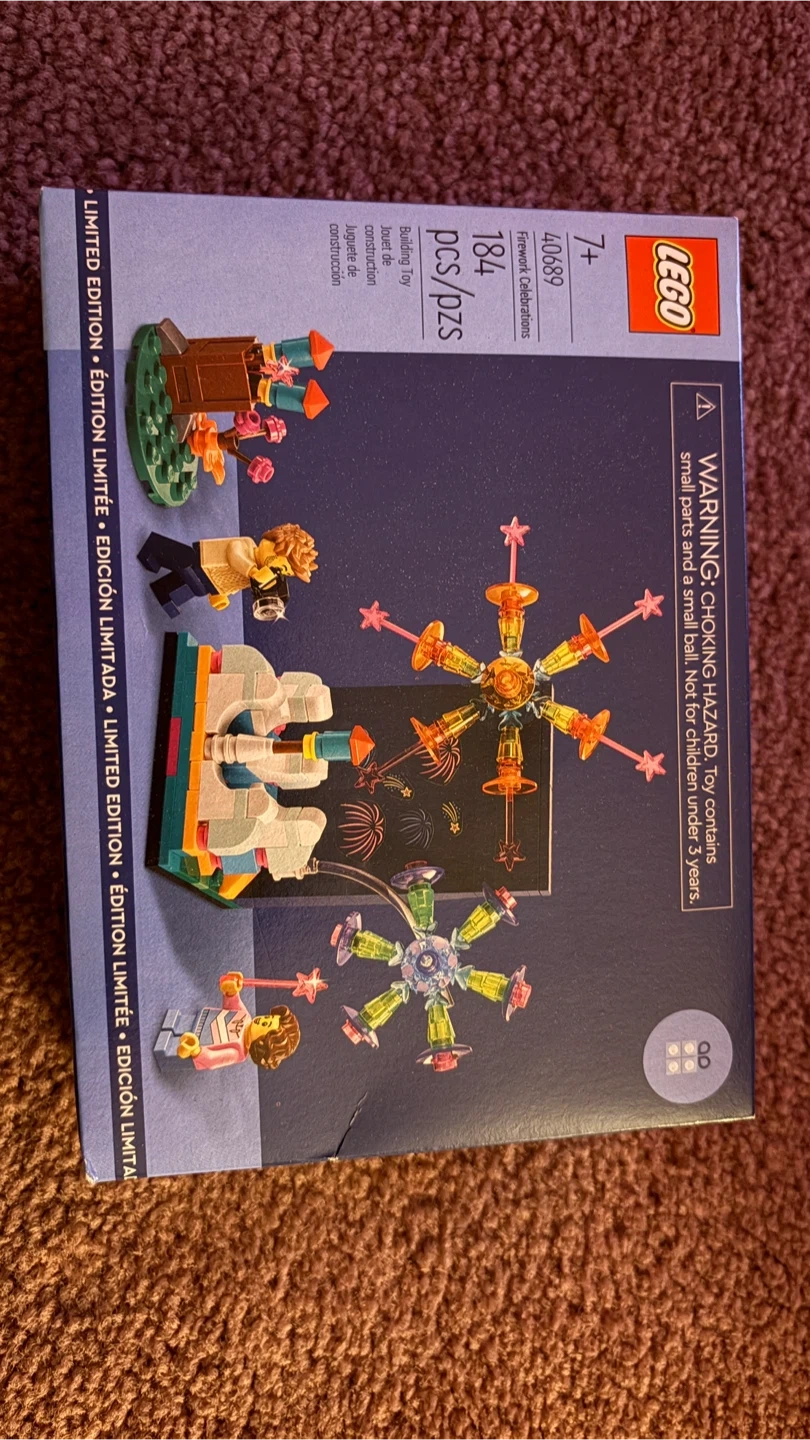 Selling a LEGO set, number 40689, called Firework Celebrations! This is a limited edition set, perfect for LEGO enthusiasts. It's designed for ages 7+ and contains 184 pieces to build a fun firework display scene. Get ready to add some sparkle to your collection!