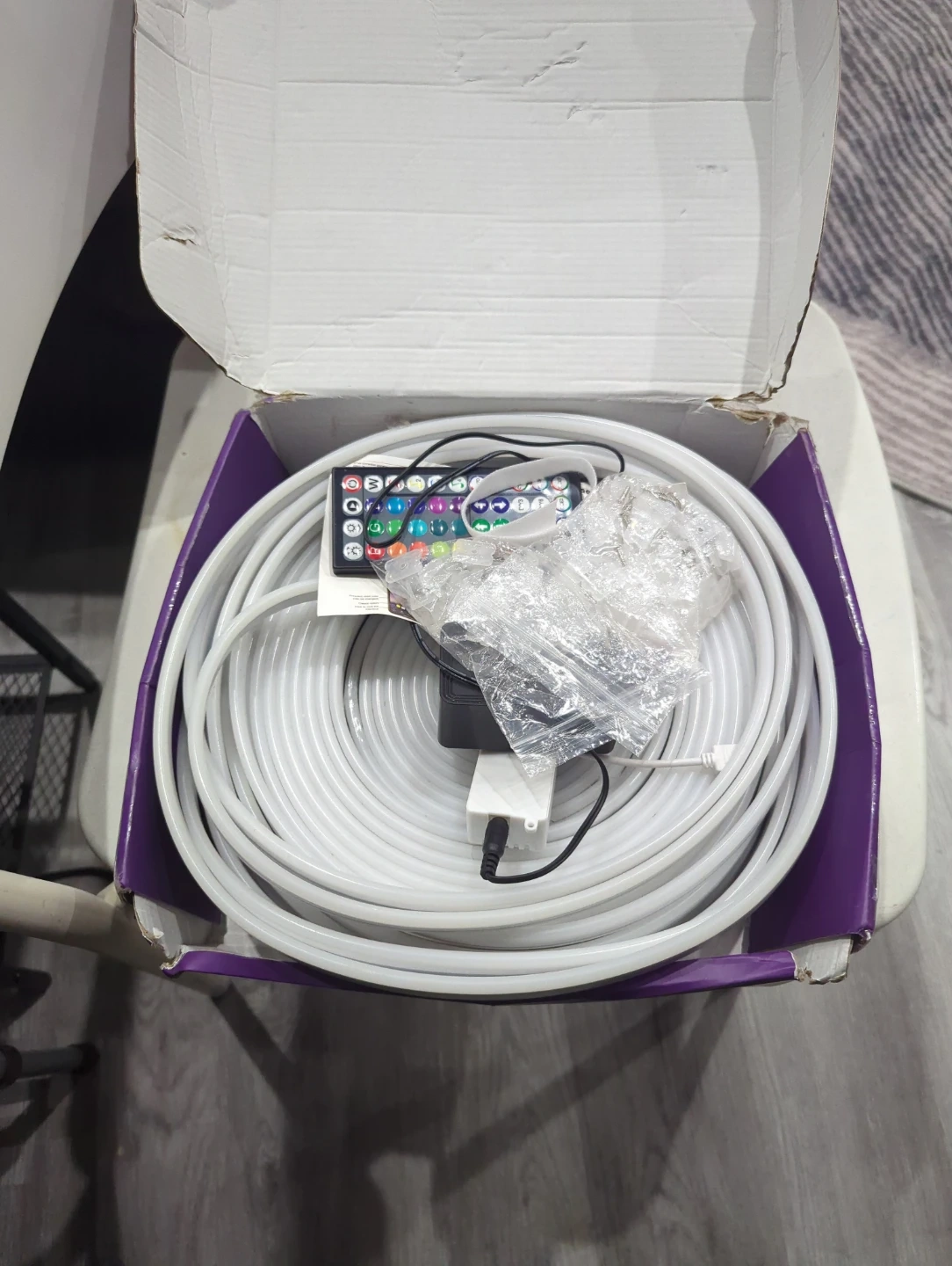 Selling a set of LED neon rope lights! It comes with a remote and all the necessary mounting clips. The lights are in great condition and ready to add some fun to any room. The box is included as well and the QR code to bind it on the app. We bought it 2 years ago from Amazon for my son but he didn't use it. The condition is very new because we never really used it too much only when it came from Amazon and it's in a Smoke free house with no pets at all.