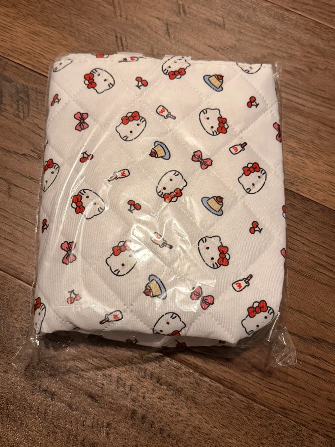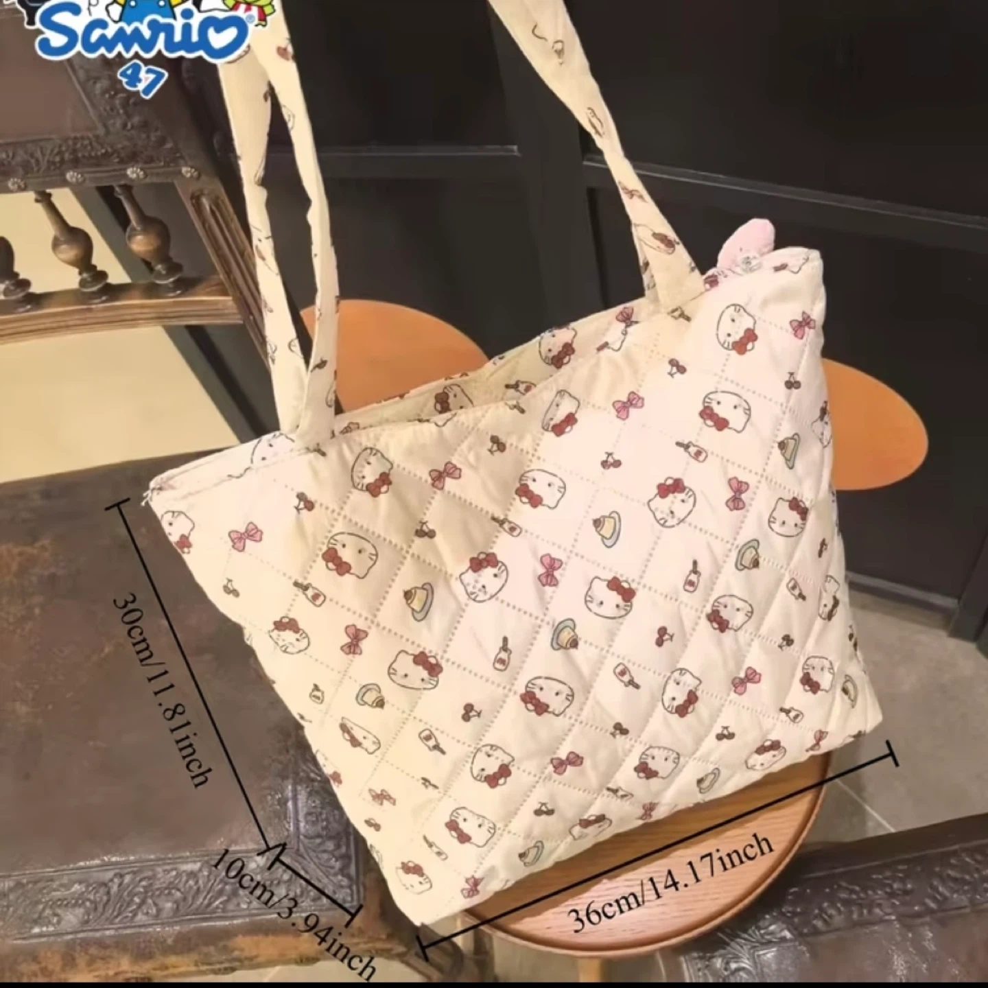 This is a brand new Sanrio Hello Kitty tote bag! It features a cute quilted design with Hello Kitty and other Sanrio characters. The quilted design is filled for sturdiness. The approximate dimensions are 36cm x 30cm x 10cm.