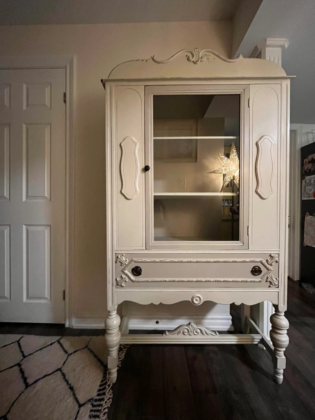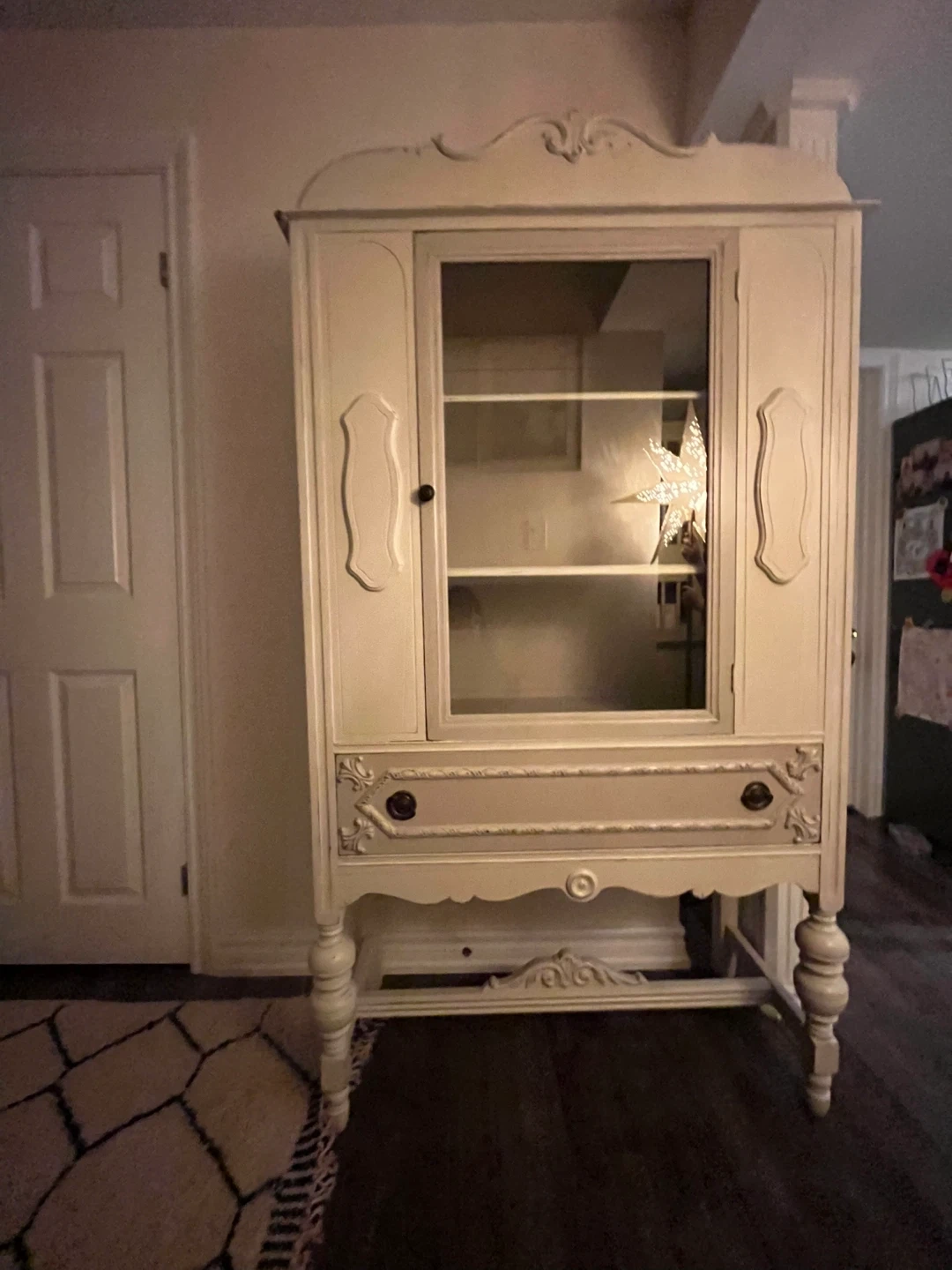 Selling a lovely antique display cabinet! It's painted in a creamy white colour and has a glass door on top for displaying your favourite items. The bottom features a drawer for extra storage. It would be a charming addition to any home!