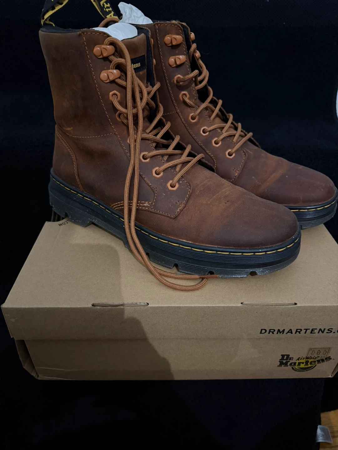 Selling a pair of Dr. Martens Combs Leather boots in warm tan. These are a US size 11. They come with the box!