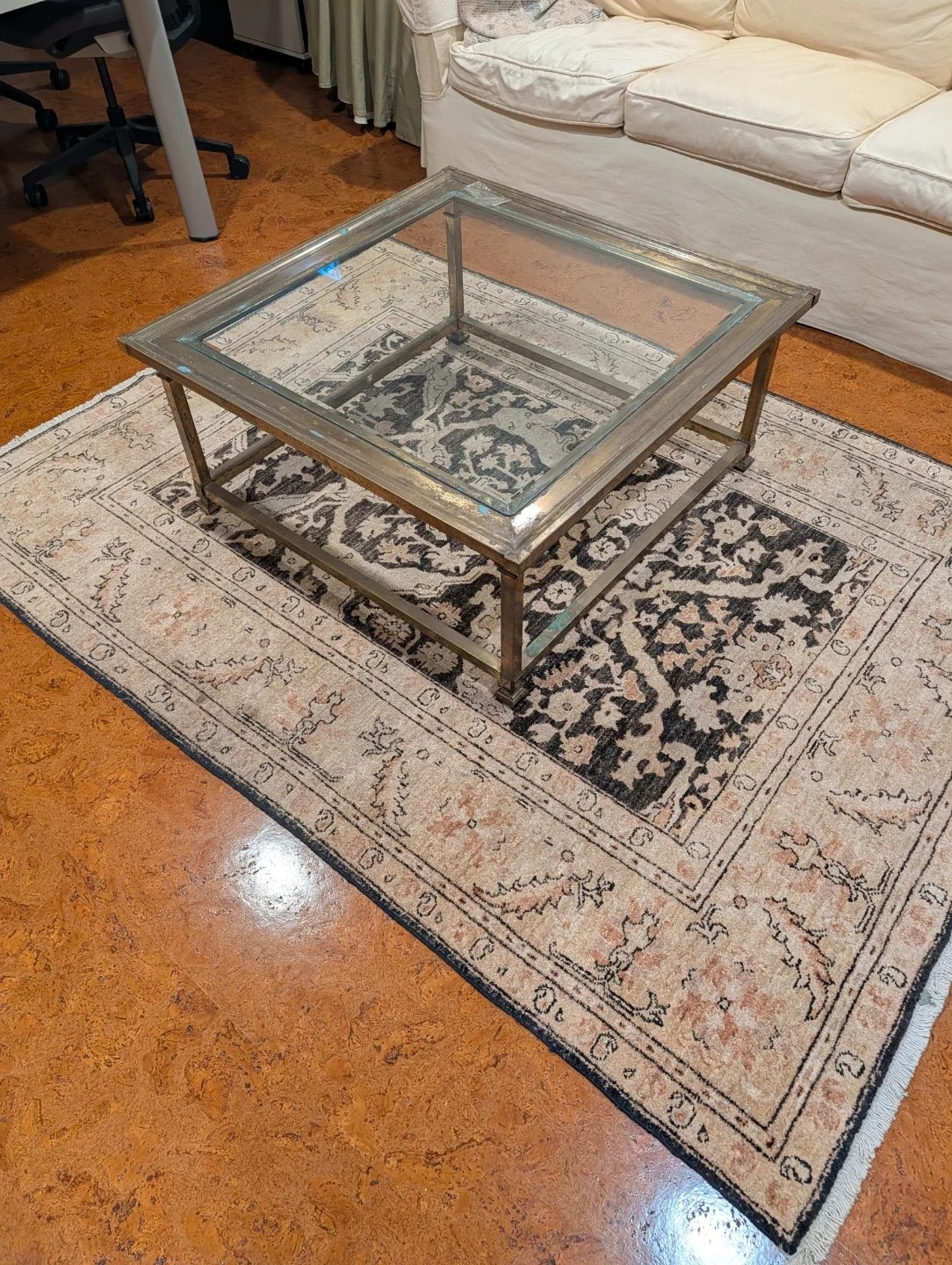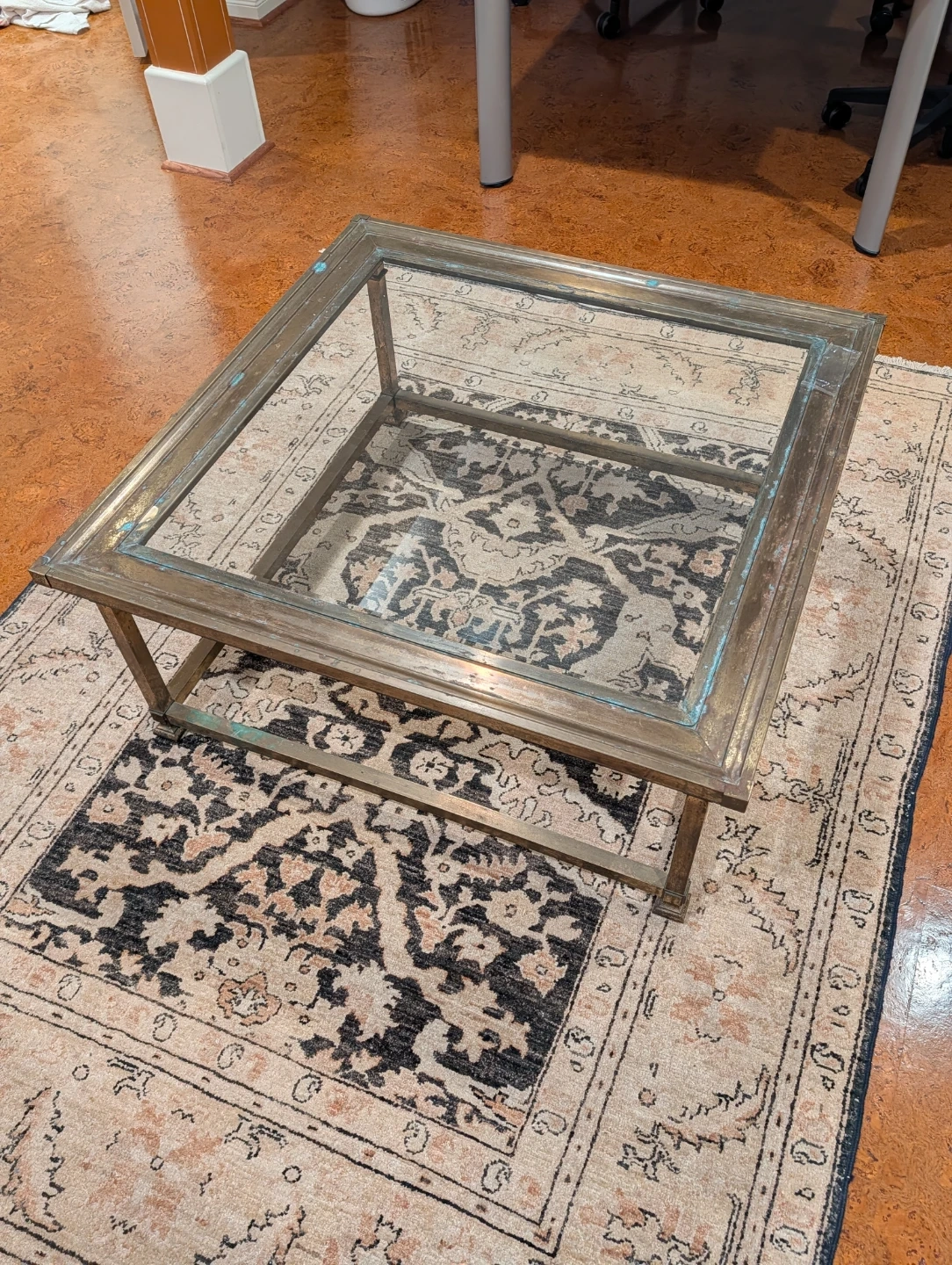 Selling an antique square brass coffee table with a glass top. It has a metal frame and a unique, stylish design. It's in good condition and would be a great addition to any living room or basement suite!