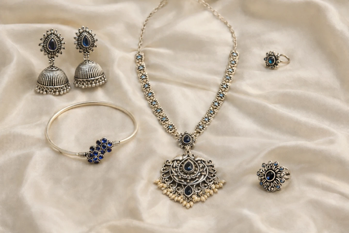 Selling a beautiful silver-tone jewellery set! It includes a necklace, earrings, a bracelet, and two rings. The set features lovely blue accents, making it a standout addition to any outfit