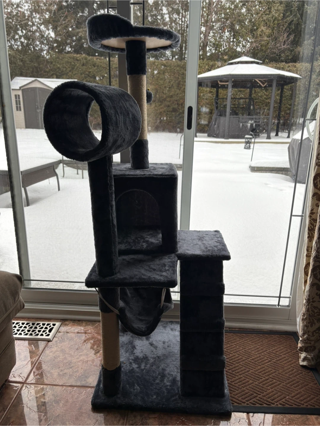 Selling a cat tree in dark blue. It's in new-like condition and ready for a new feline friend to enjoy! It features multiple levels, a scratching post, and a cozy hideaway. Perfect for keeping your kitty entertained and off your furniture