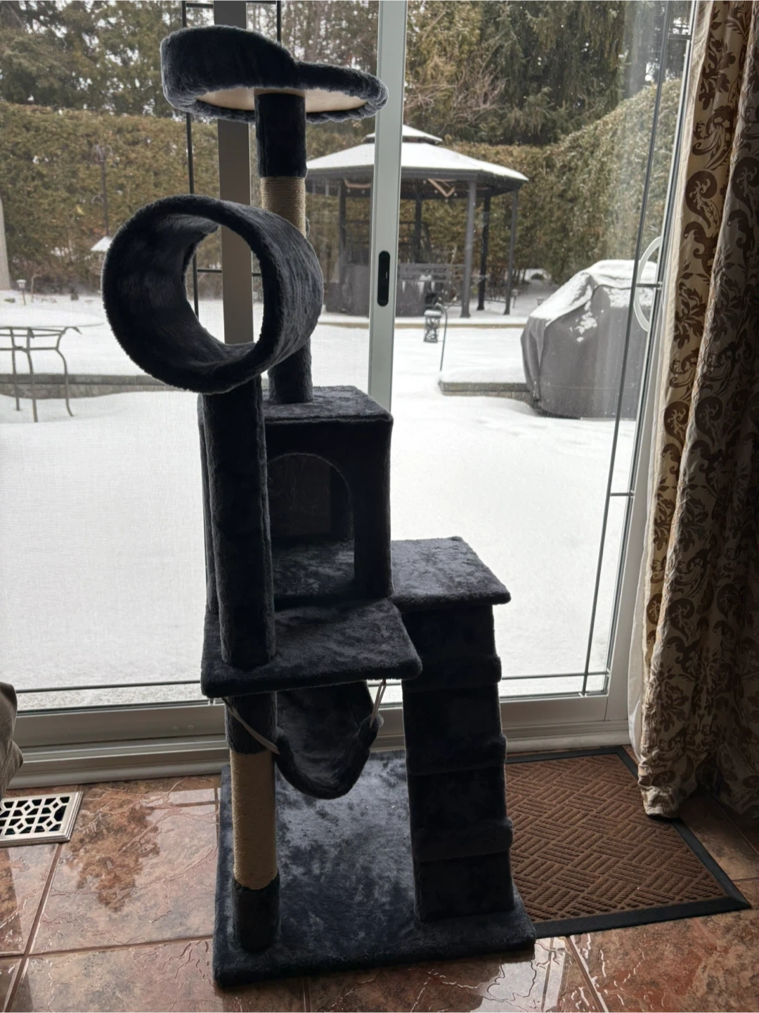 Selling a cat tree in dark blue. It's in new-like condition and ready for a new feline friend to enjoy! It features multiple levels, a scratching post, and a cozy hideaway. Perfect for keeping your kitty entertained and off your furniture
