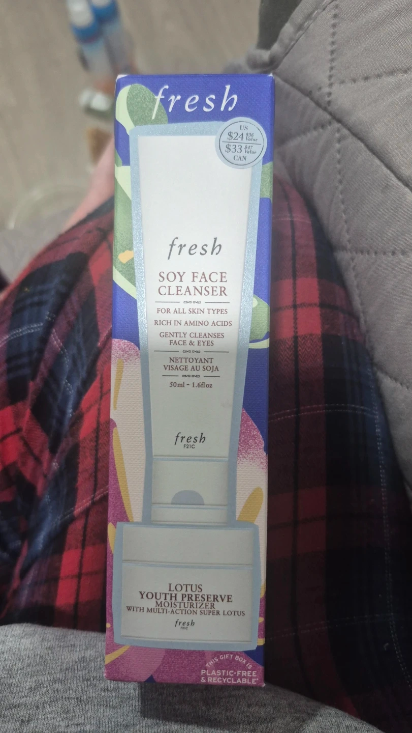 This is a Fresh Cleanse & Moisturize Duo, featuring the Soy Face Cleanser and Lotus Youth Preserve Moisturizer. The cleanser is an extra-gentle gel that melts away impurities and makeup. The moisturizer targets first signs of aging and protects for radiant, youthful face. Originally priced at $33 CAD