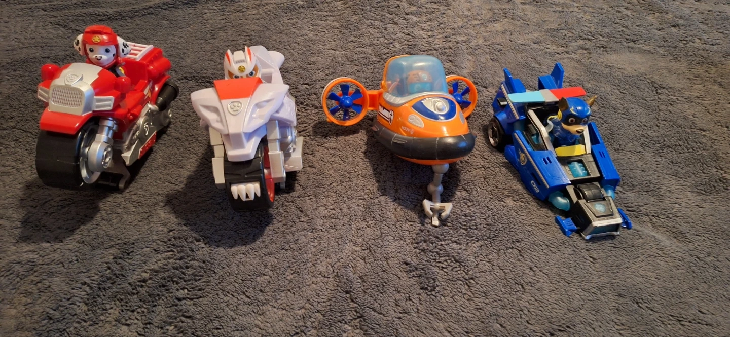 Selling a set of Paw Patrol vehicles! Includes Marshall's motorcycle, Rubble's motorcycle, Skye's hovercraft, and Chase's vehicle. Great for any Paw Patrol fan!