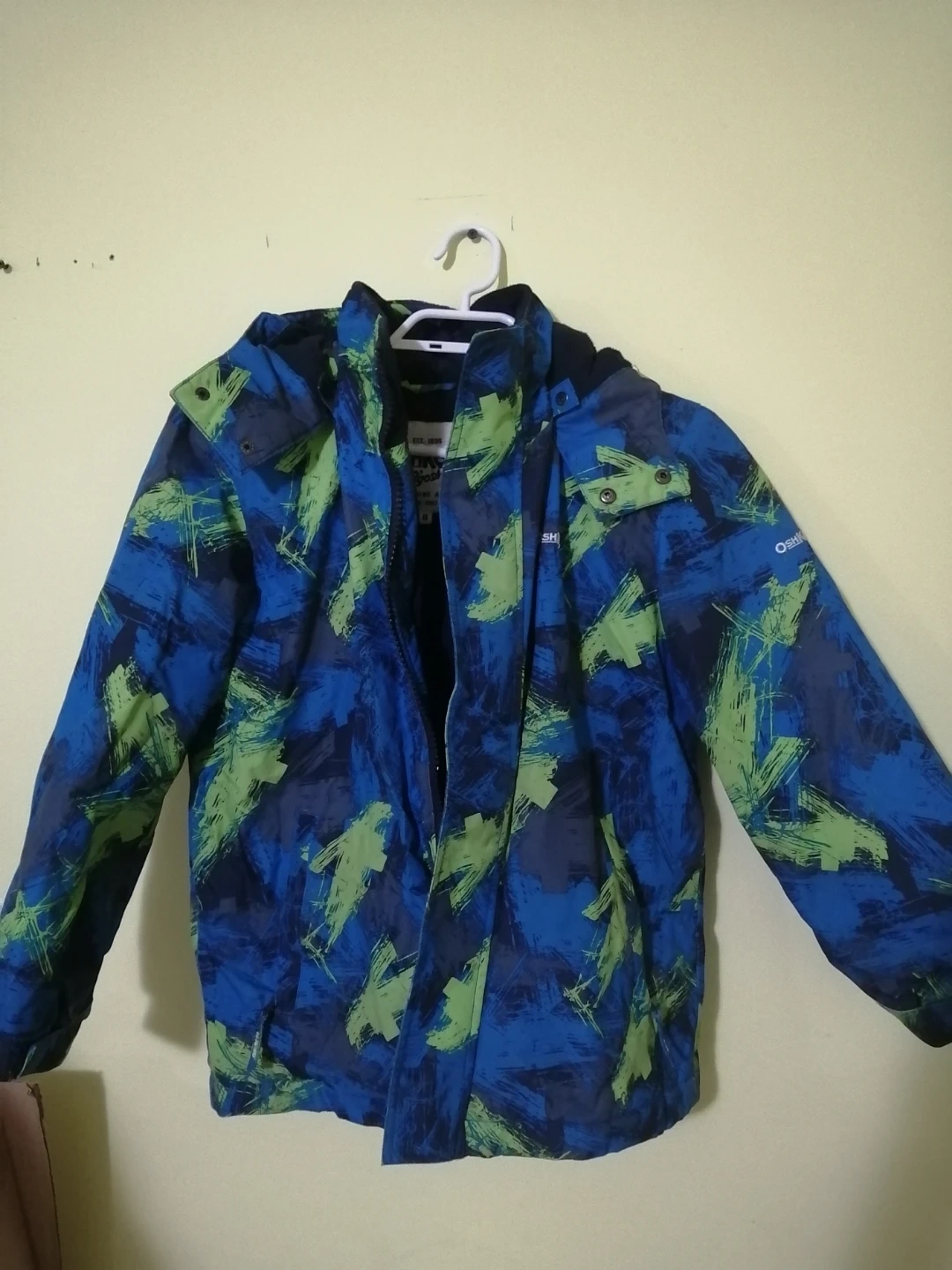 Two warm winter jackets for kids! One is an OshKosh B'gosh jacket with a blue and green abstract pattern. The other is a Land's End jacket in green with a red fleece lining. Both are in great condition and ready for the cold weather