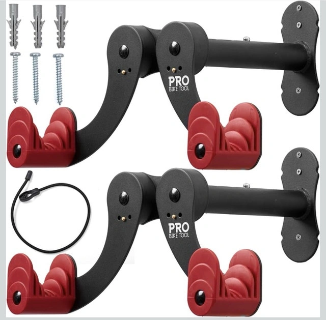 PRO BIKE TOOL Bike Wall Mount - Adjustable Hanging Arms Horizontal Bike Rack - For Almost Every Bike - Bike Wall Hanger with Durable Metal Construction - Black/Red - Set of 2