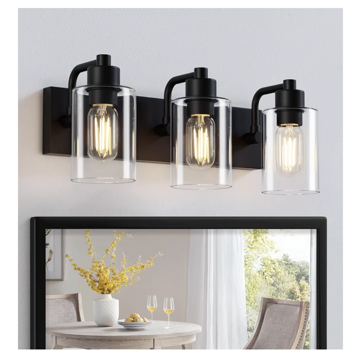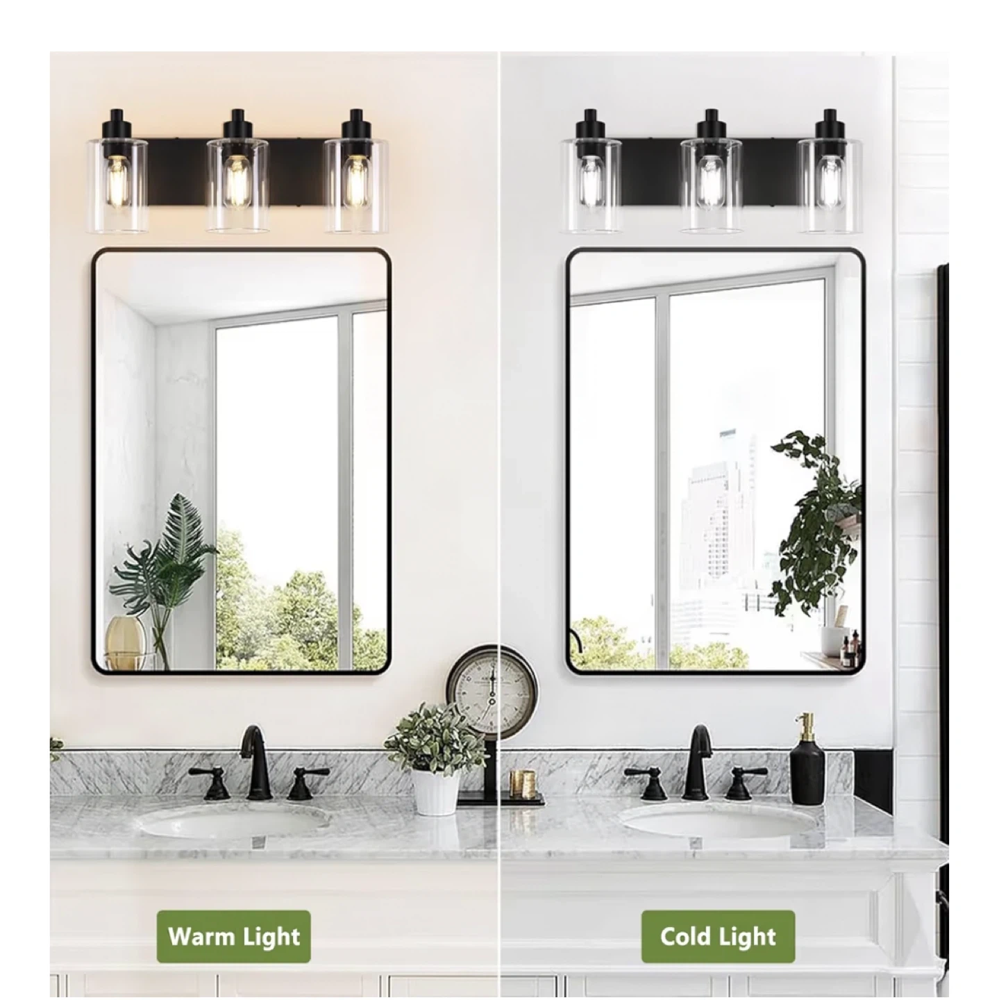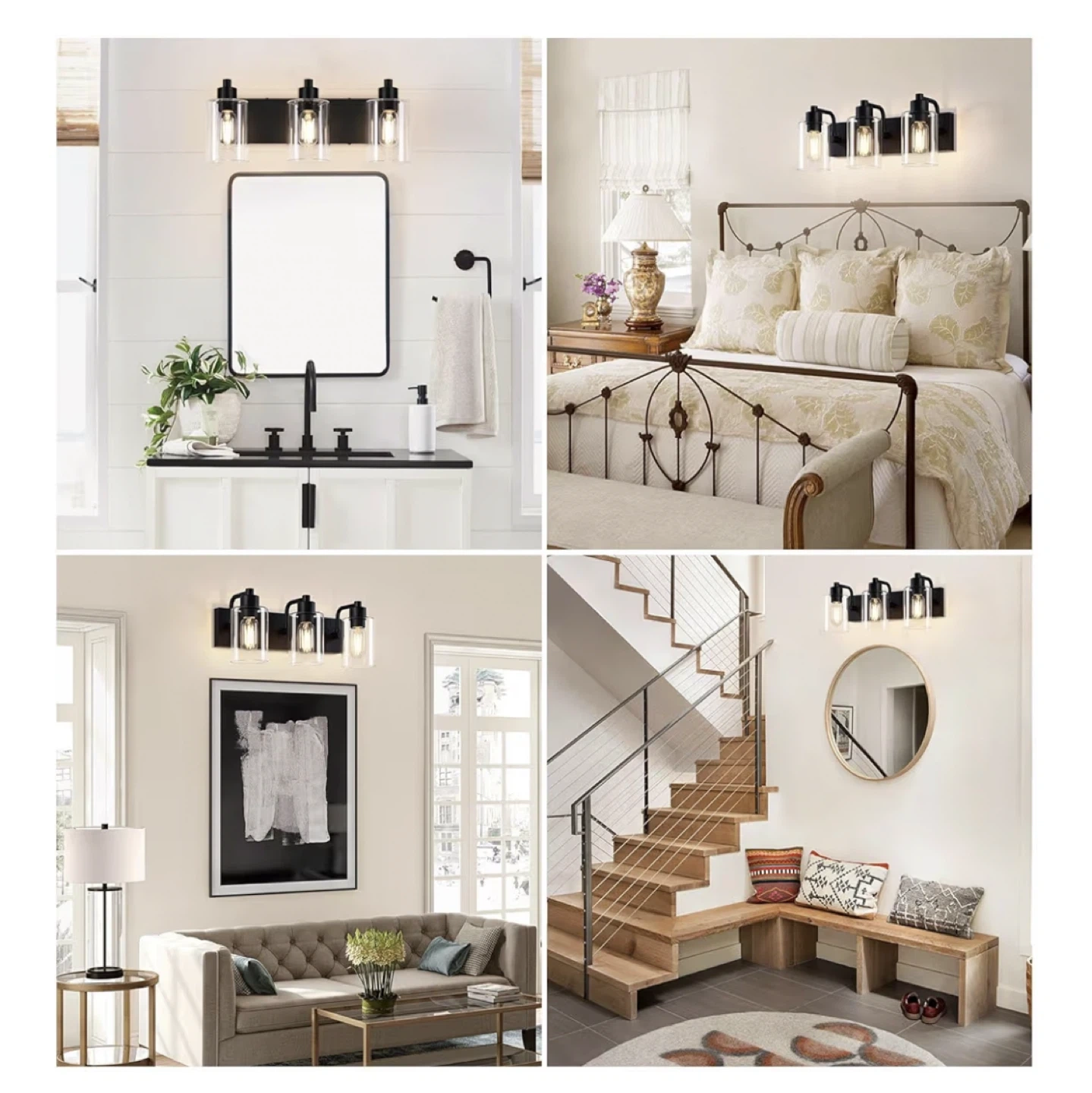 Add a touch of elegance to your bathroom with this 3-light vanity fixture! It features a sleek black finish and clear glass shades, perfect for creating a warm and inviting atmosphere. The fixture is designed for E26 bulbs (not included) and supports a voltage of 110V-130V with a max wattage of 60W. The dimensions are approximately 6.7 inches (17 cm) in height, 16.9 inches (43 cm) in width, and each light extends about 5.5 inches (14 cm) from the wall