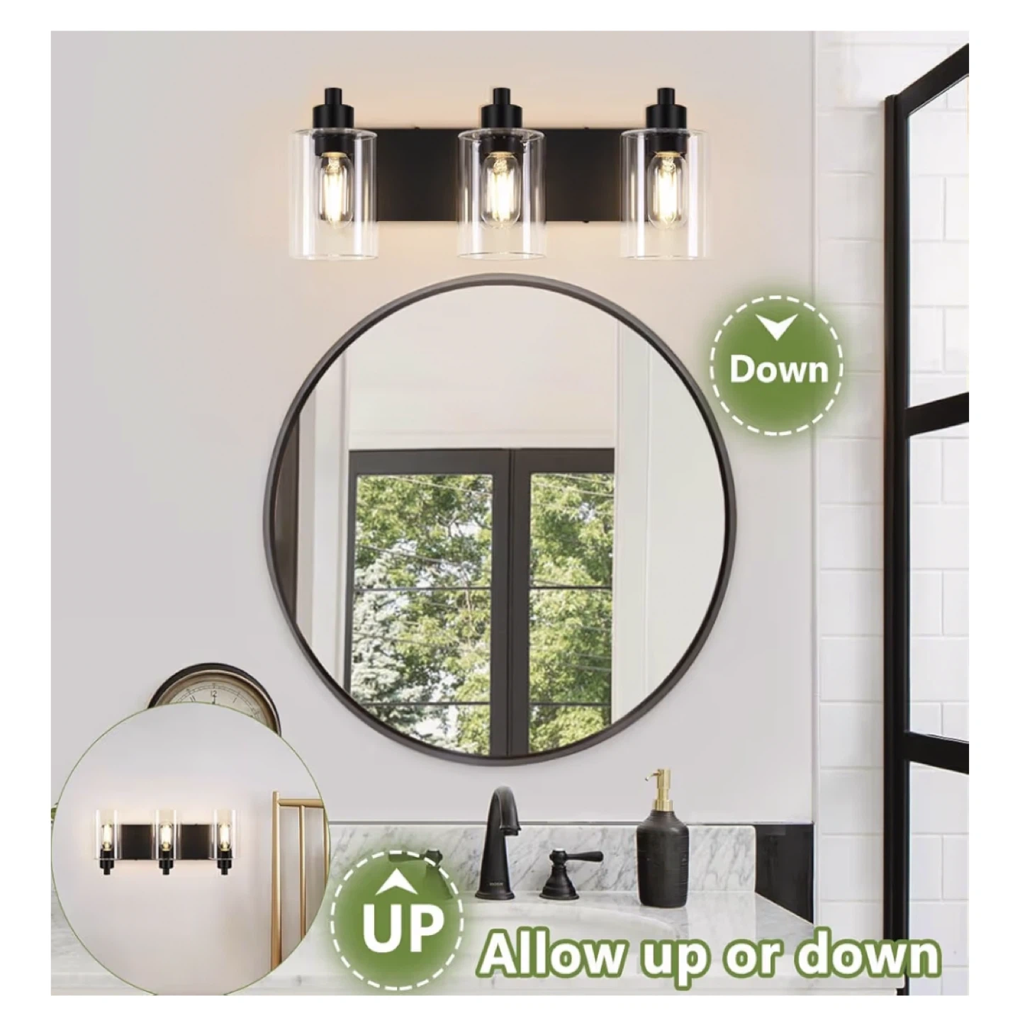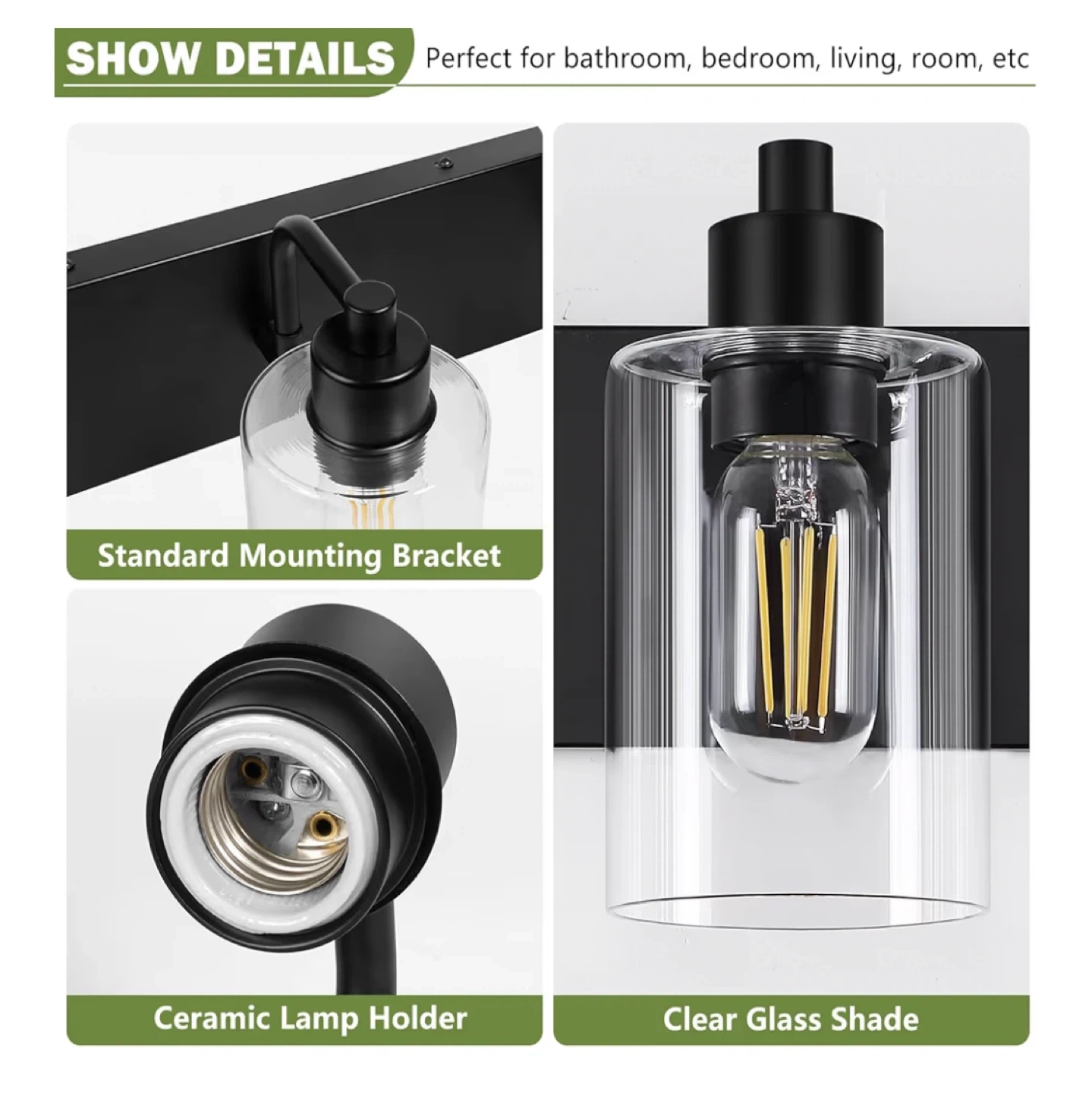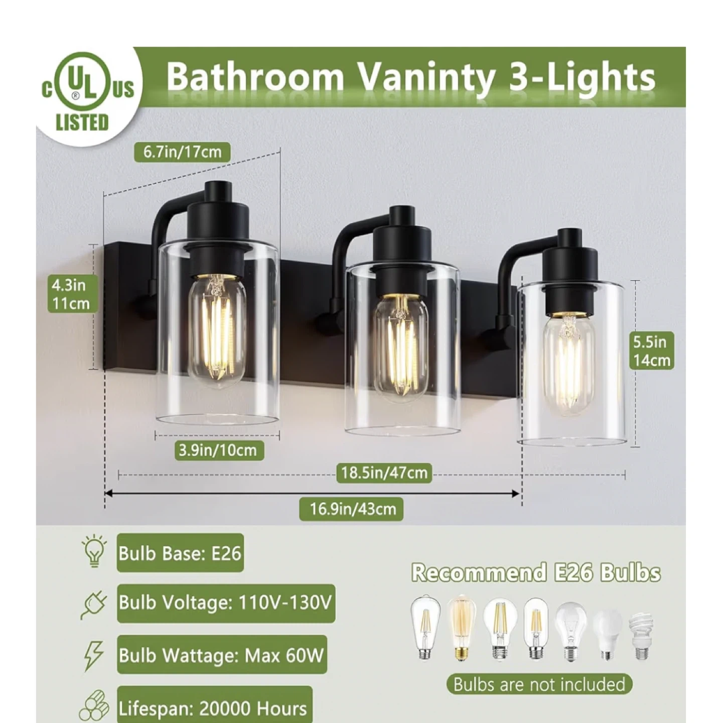 Add a touch of elegance to your bathroom with this 3-light vanity fixture! It features a sleek black finish and clear glass shades, perfect for creating a warm and inviting atmosphere. The fixture is designed for E26 bulbs (not included) and supports a voltage of 110V-130V with a max wattage of 60W. The dimensions are approximately 6.7 inches (17 cm) in height, 16.9 inches (43 cm) in width, and each light extends about 5.5 inches (14 cm) from the wall