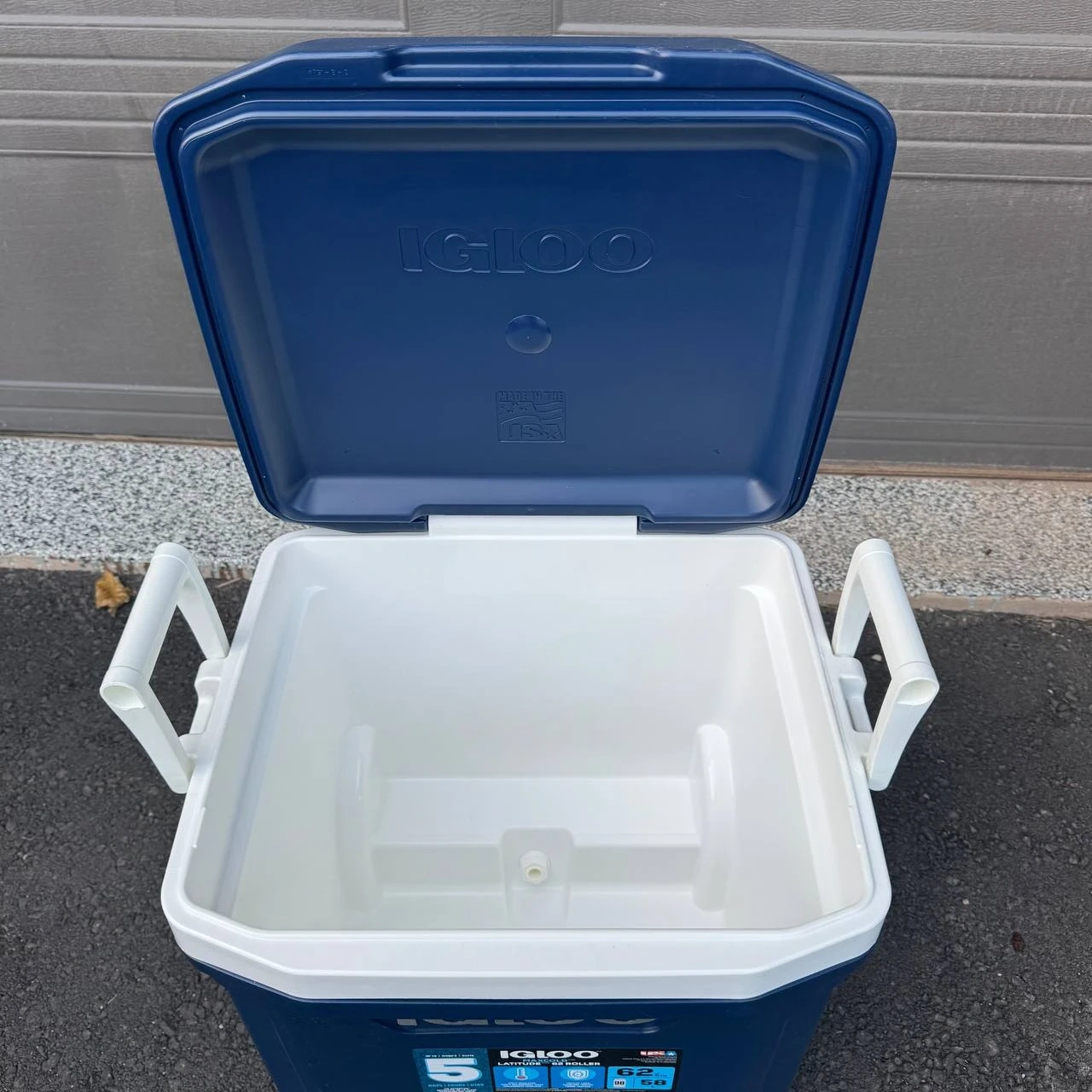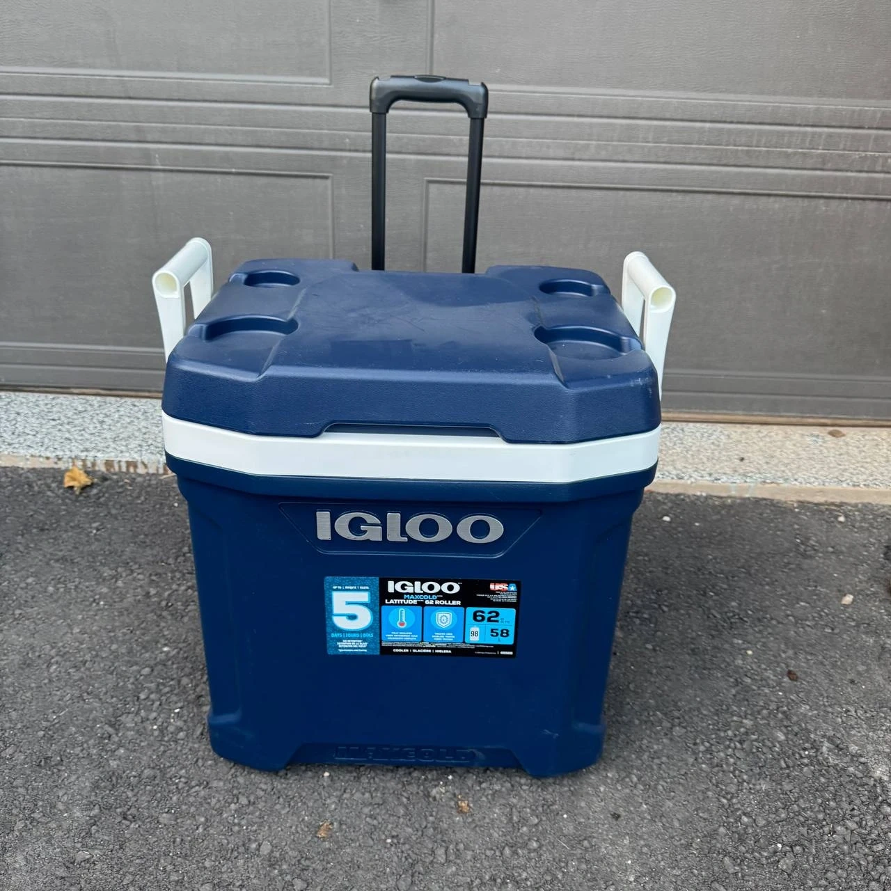 Brand New 62 qt (58 L) rolling cooler with telescoping handle. Keeps ice up to 5 days, durable design, perfect for trips, picnics, and camping. Pick up in Oakville