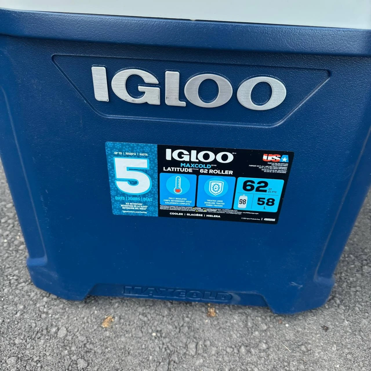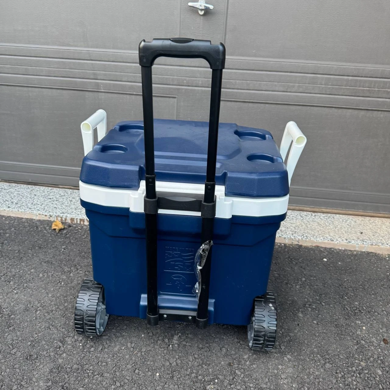 Brand New 62 qt (58 L) rolling cooler with telescoping handle. Keeps ice up to 5 days, durable design, perfect for trips, picnics, and camping. Pick up in Oakville