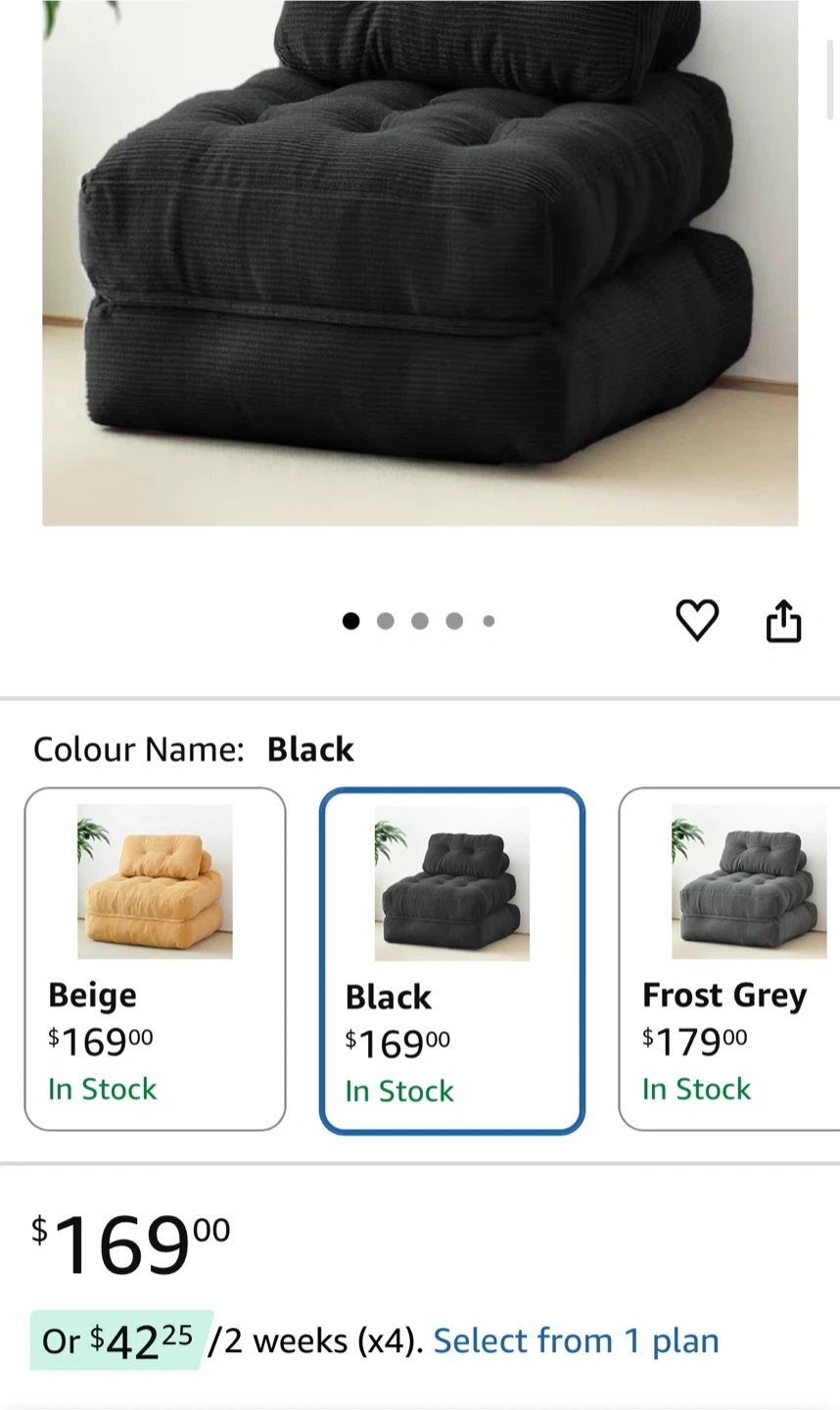 Selling a comfy black corduroy floor cushion chair! It's in great condition and comes in its original box. Perfect for adding some extra seating to your living room or bedroom. Check out the dimensions in the picture!
