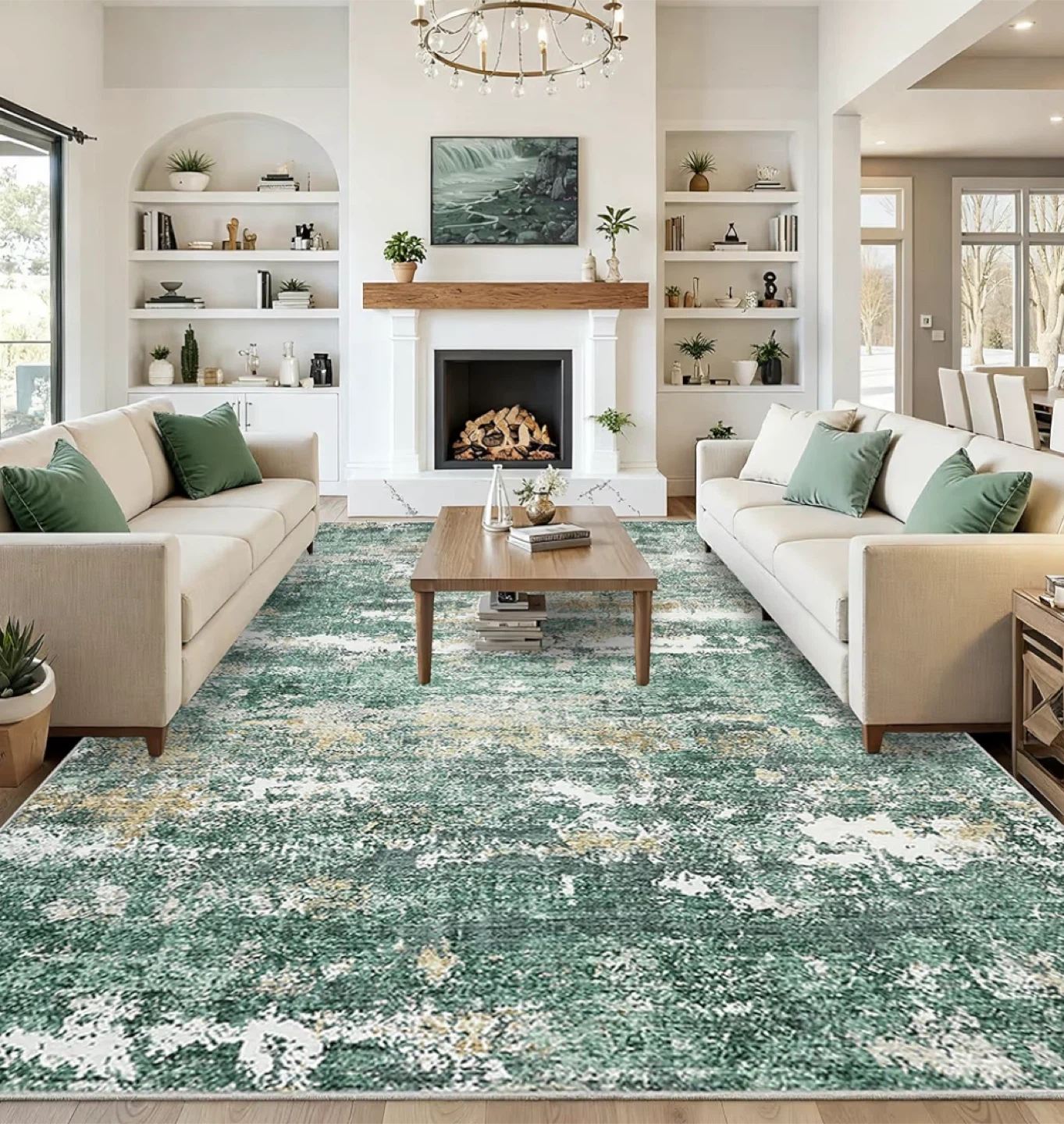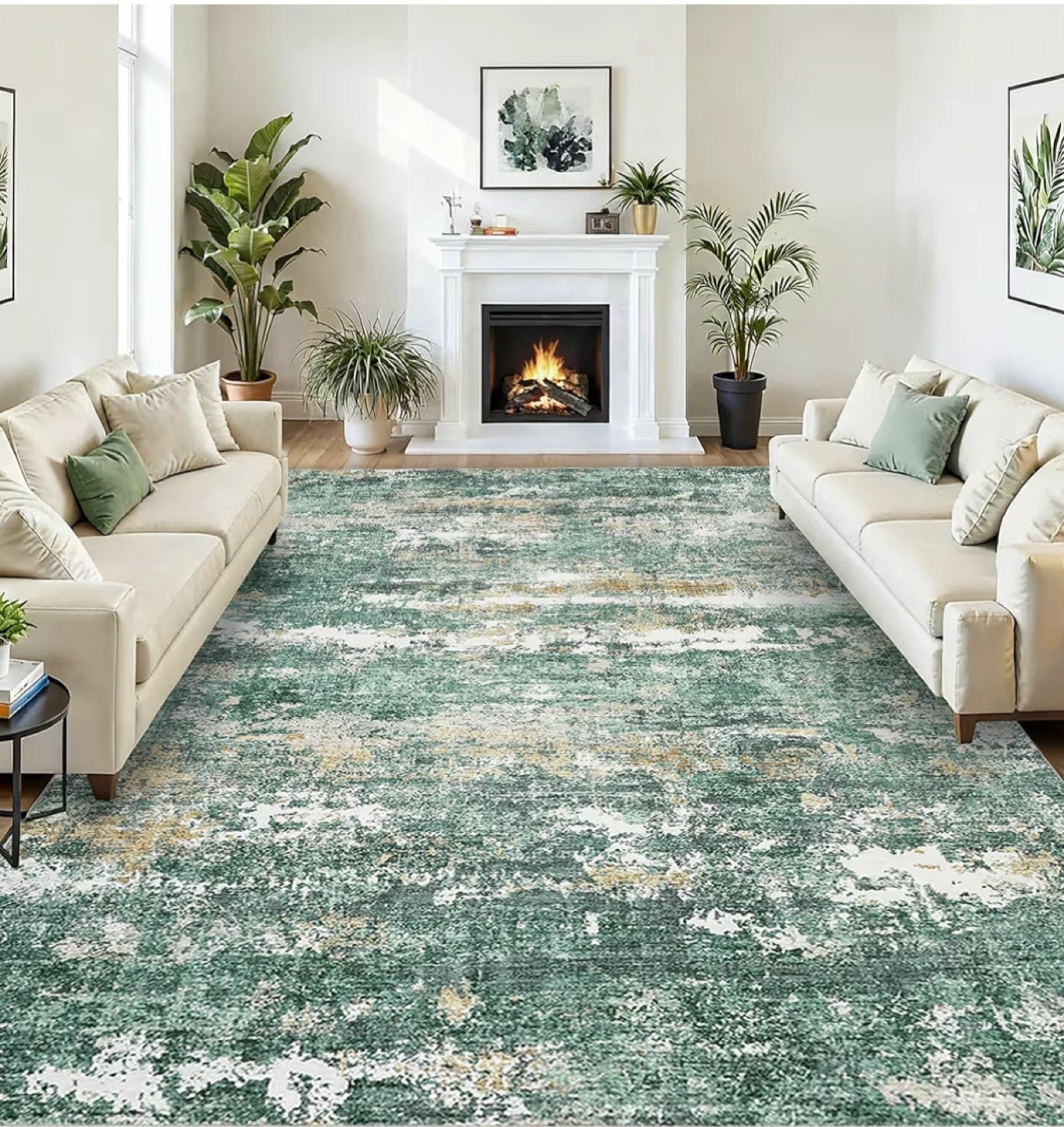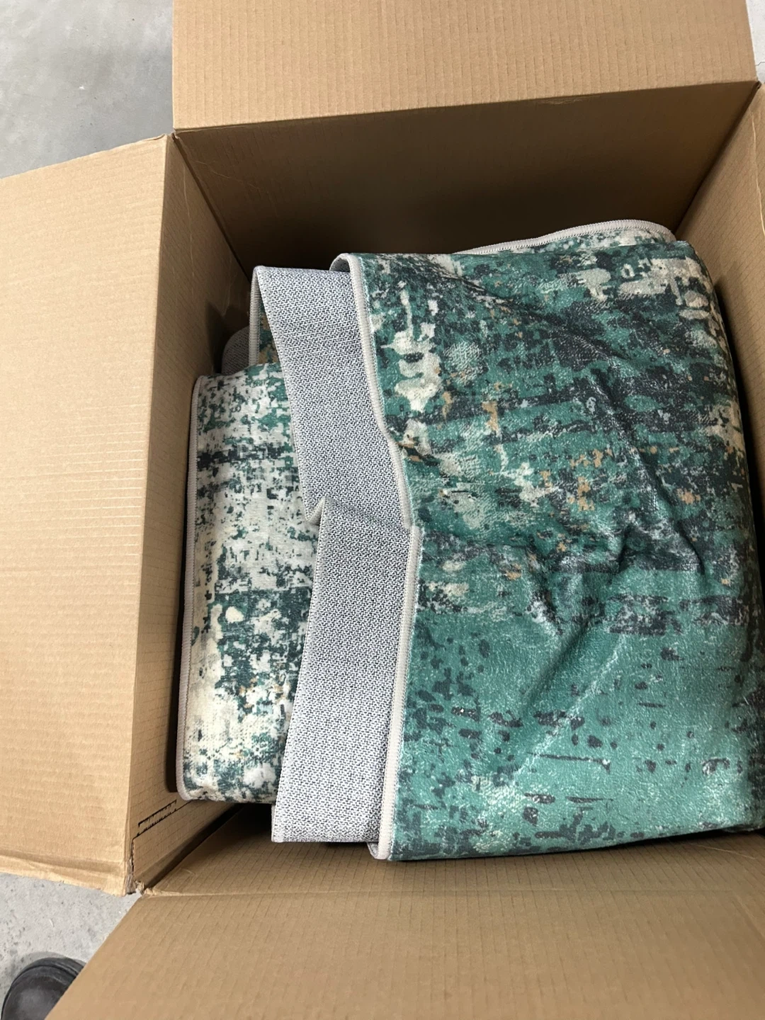Selling a brand new, machine washable rug with a distressed green pattern. It's still in its original box, ready to add a touch of style to your home! The rug is designed to be machine washable, making it super easy to keep clean and looking great