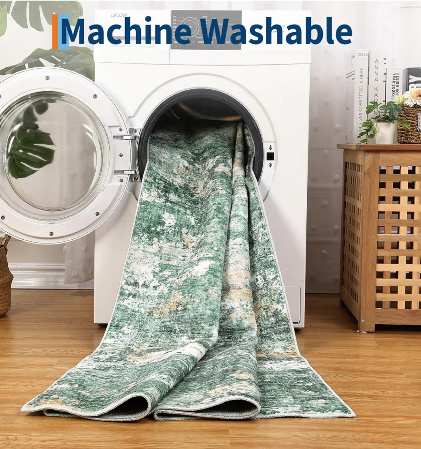 Selling a brand new, machine washable rug with a distressed green pattern. It's still in its original box, ready to add a touch of style to your home! The rug is designed to be machine washable, making it super easy to keep clean and looking great