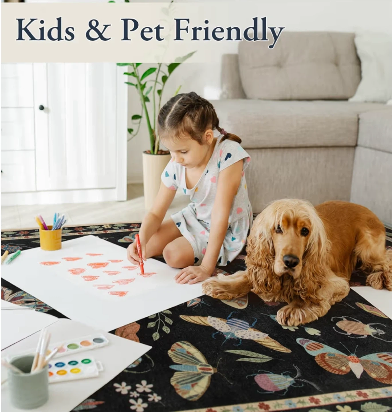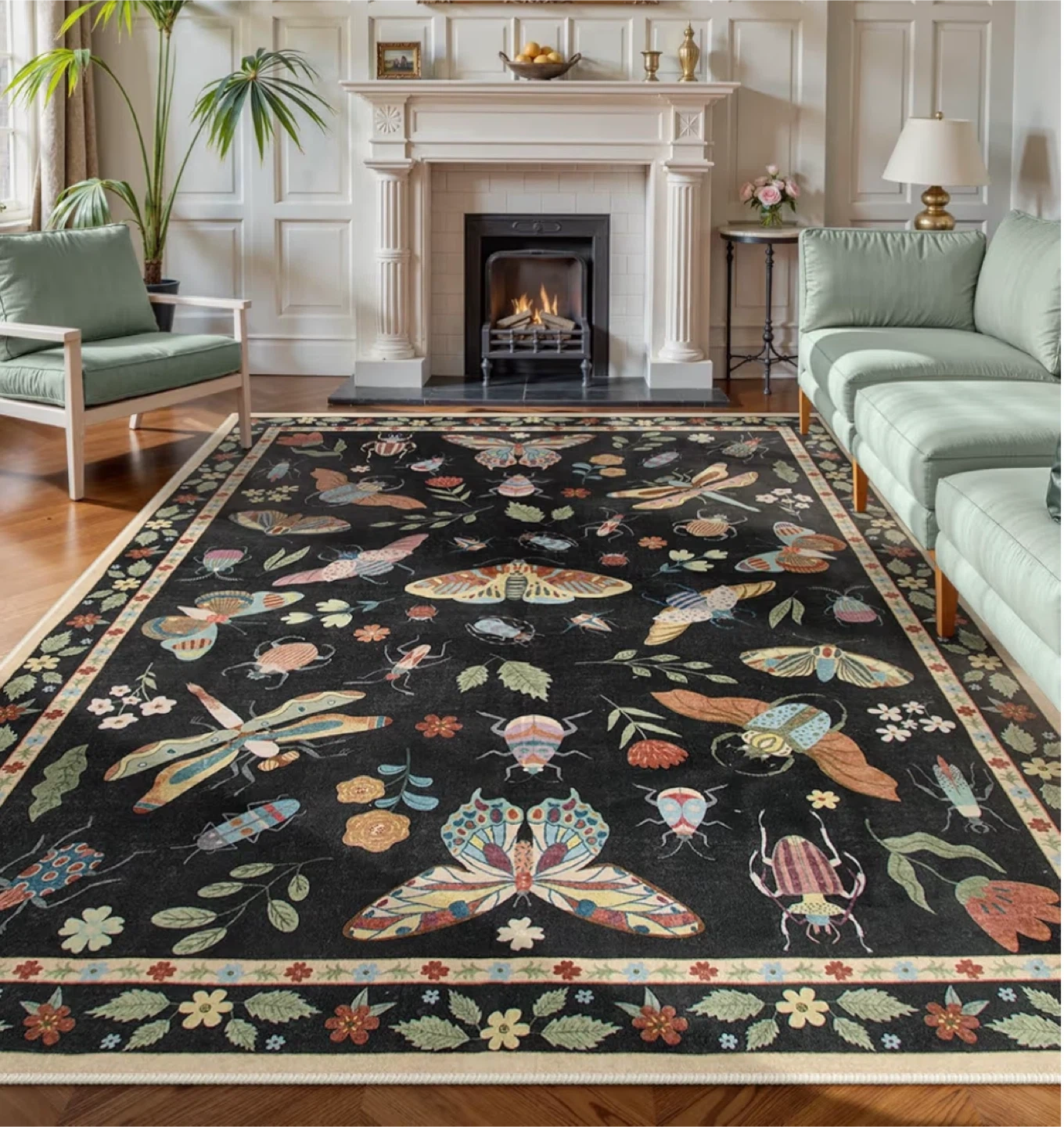 This is a Lahome washable rug featuring a butterfly and insect design. It's easy to clean and adds a touch of whimsy to any room. The rug is brand new and still in its original packaging!