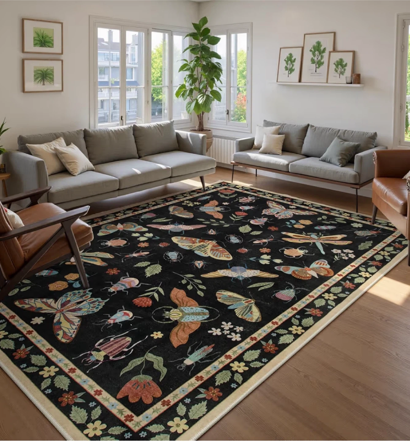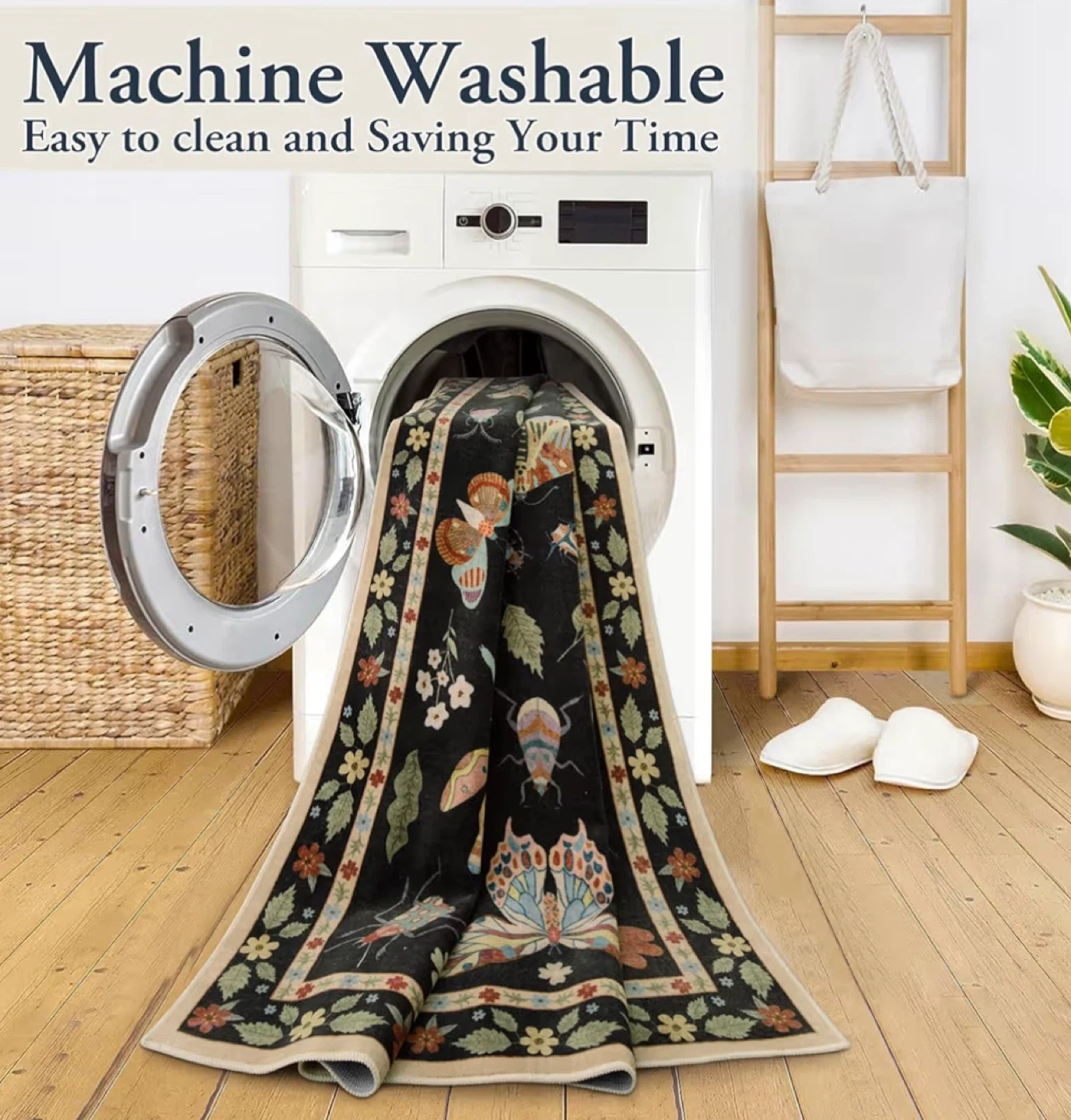 This is a Lahome washable rug featuring a butterfly and insect design. It's easy to clean and adds a touch of whimsy to any room. The rug is brand new and still in its original packaging!