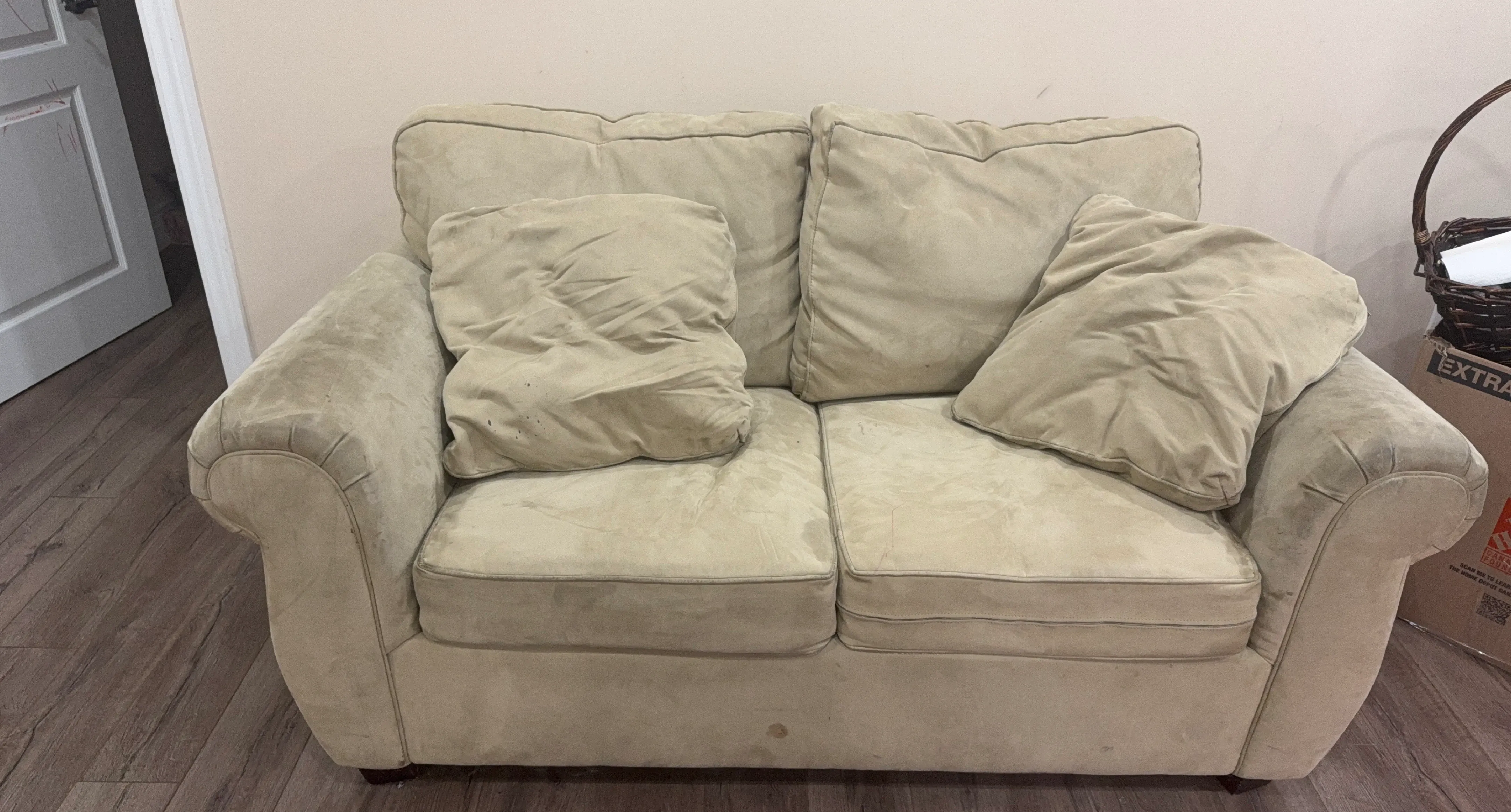 Selling a comfy beige loveseat sofa. It has a soft, inviting feel. It's perfect for a smaller space or as an extra seating option! There are some signs of use.