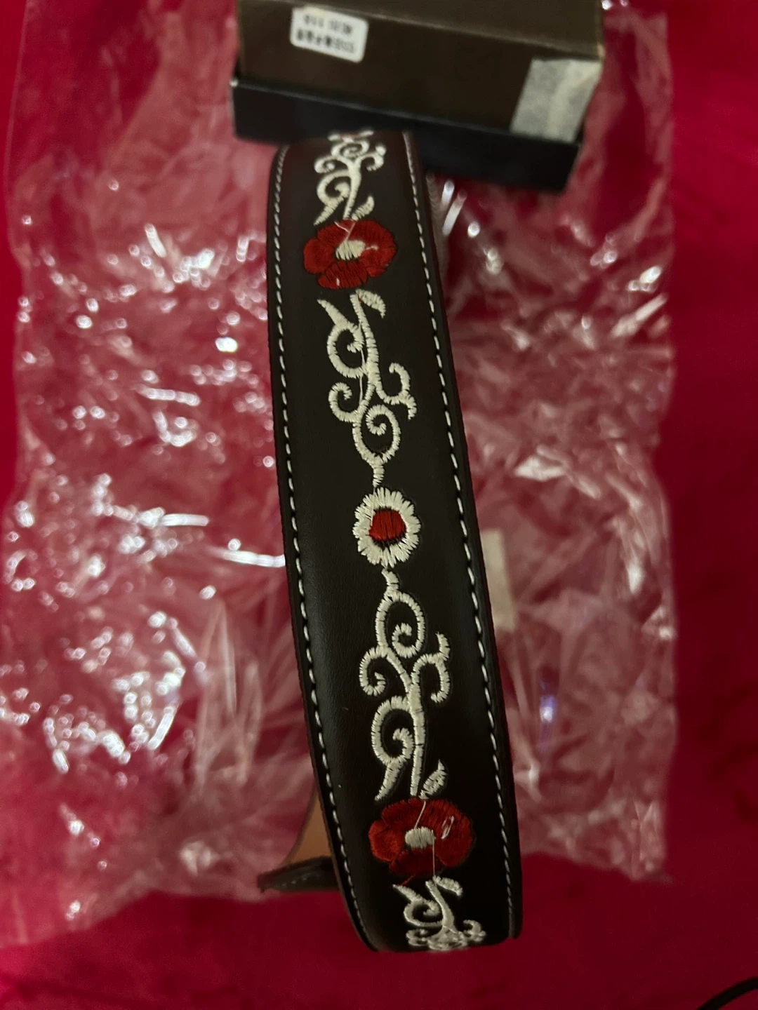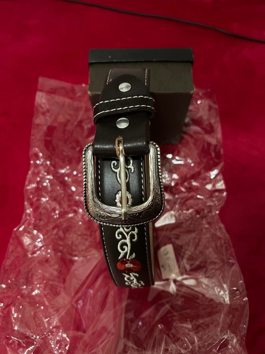 Selling a beautiful leather belt with intricate floral embroidery! It's in great condition and comes with its original box. Perfect for adding a touch of style to any outfit