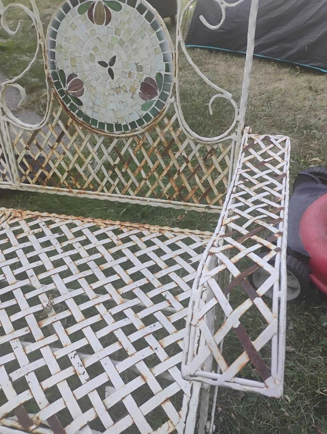 Rare Vintage French Country White Wrought Iron Tiled Bench w Parrots Two Seateral and a tile mosaic Folding ASKING $400 PICK UP ON BEAVERBROOK LANE KANATA THANK YOU A bit if rust but can easily be restored Gorgeous Bench in Great Vintage Condition. Solid and Firm. Wear is usual for its age. Please see photos. Overall a Gorgeous Bench that you will love having in your home!! Measurements: 35"High x 44"W x 21"x SH 16" Please keep in mind that this is a Vintage Piece and has its normal signs of wear. This is what gives it it's character and confirms its age. Note: Please use photos as part of the description. If you have any questions please feel free TO ASK thank you