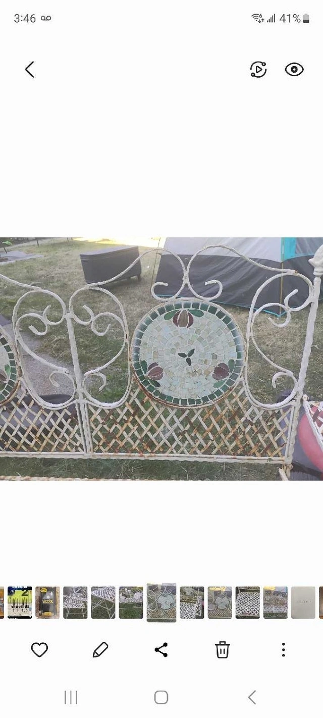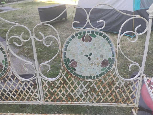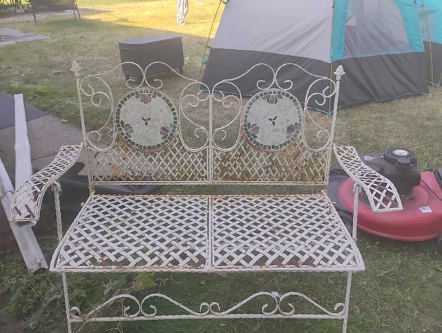 Rare Vintage French Country White Wrought Iron Tiled Bench w Parrots Two Seateral and a tile mosaic Folding ASKING $400 PICK UP ON BEAVERBROOK LANE KANATA THANK YOU A bit if rust but can easily be restored Gorgeous Bench in Great Vintage Condition. Solid and Firm. Wear is usual for its age. Please see photos. Overall a Gorgeous Bench that you will love having in your home!! Measurements: 35"High x 44"W x 21"x SH 16" Please keep in mind that this is a Vintage Piece and has its normal signs of wear. This is what gives it it's character and confirms its age. Note: Please use photos as part of the description. If you have any questions please feel free TO ASK thank you