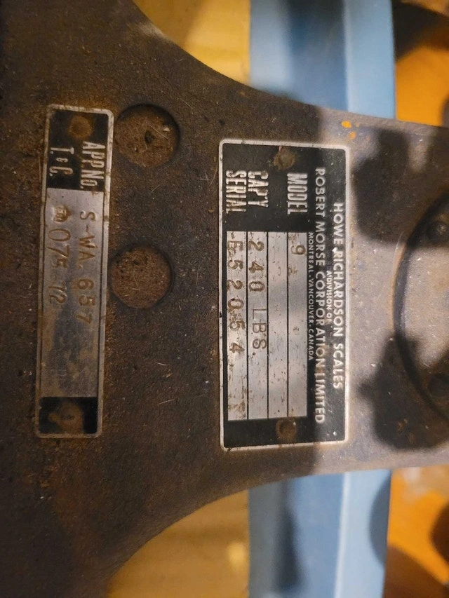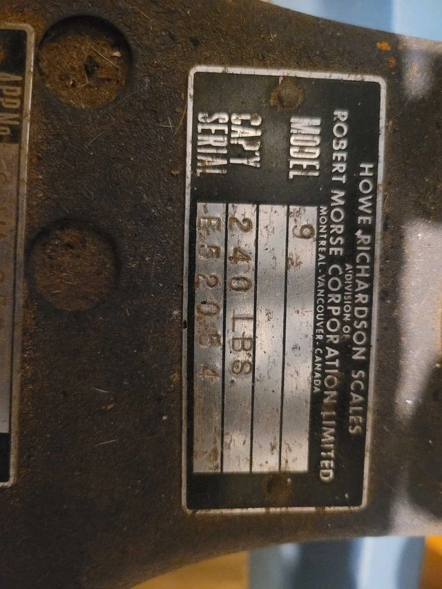 Antique Howe Richardson Table Scale in good working condition Asking $30 pick up on beaverbrook lane Kanata thank you For sell is this Howe Richardson scale, a company that manufactured weighing equipment. The company had operations in Montreal and Vancouver, Canada, and the plate indicates the following specifications: Manufacturer: Howe Richardson Scales, a division of Robert Morse Corporation Limited. Model: 9. Capacity (CAPY): 240 Lbs. Serial: E52054. Approval Number (APP No.):
