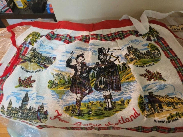 Asking $20 for the pair, pick up on Beaverbrook Lane in Kanata, thank you. For sale are these 2 x Vintage New Cooking Aprons: 1 Christmas Cardinal Christmas Winter Poinsettia Greenery Cardinal Craft Cotton Fabric Apron and the other England. The image appears to feature illustrations of famous Scottish landmarks and culture. The towel depicts two people in traditional Scottish attire, including kilts and bagpipes, suggesting a cultural theme. Buildings labeled on the towel include Edinburgh Castle and Glamis Castle. A building labeled Burns' Cot likely refers to Robert Burns' Cottage, the birthplace of the famous Scottish poet. The text "Scotland" is visible at the bottom right. Edinburgh Castle is a historic fortress and a world-famous icon of Scotland, known as one of the oldest fortified places in Europe. Christmas Cardinal Christmas Winter Poinsettia Greenery Cardinal Craft Cotton Fabric Sewing Panel. More Info: Other For Sale By: Owner