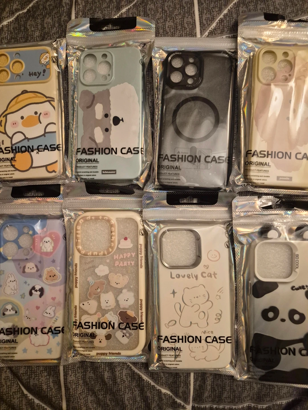 I have a selection of new fashion phone cases, still in their original packaging! They come in a variety of cute designs, including a duck, a schnauzer, and a panda. Perfect for adding a bit of fun to your phone!
