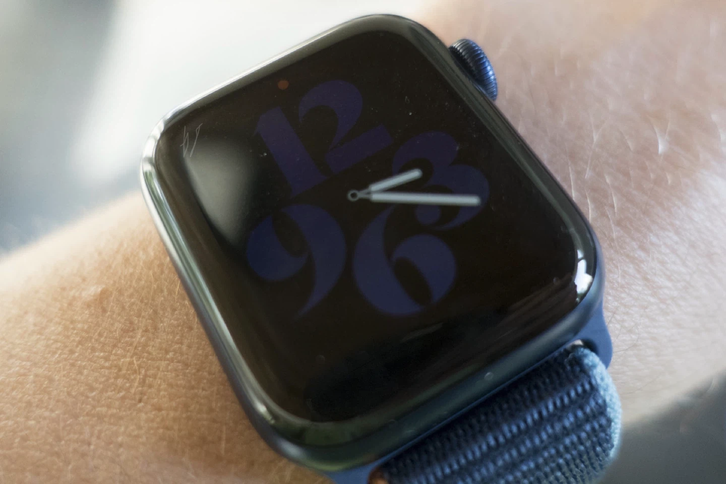 The watch shows some signs of wear. There is a small scratch on the top left of the screen.