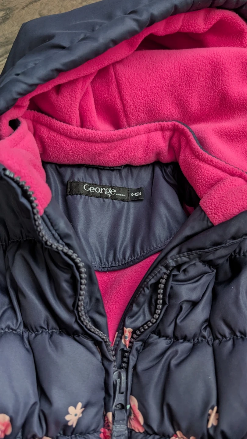 Here's a super cute puffer jacket for your little one! It's a George brand jacket, sized 6-12 months. The jacket is navy blue with a pink fleece lining and a floral pattern on the bottom. Perfect for keeping baby warm and stylish!